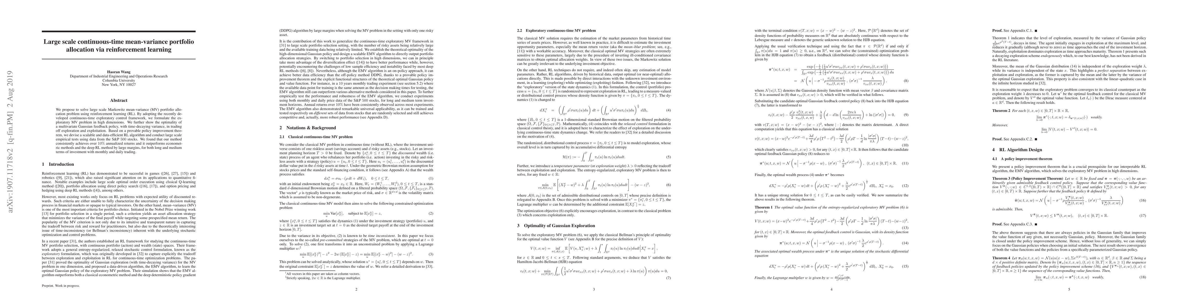 This paper proposes a reinforcement learning approach to solve large scale continuous-time mean-variance portfolio allocation, achieving over 10% annualized returns and outperforming traditional econometric methods and deep RL methods in long and medium-term investments.
