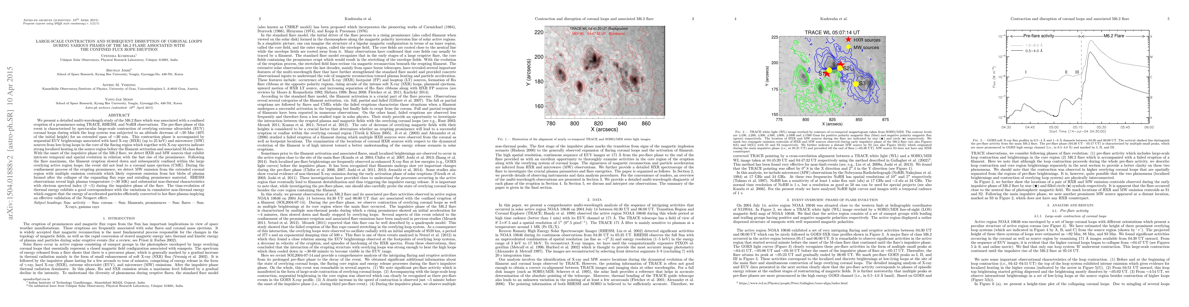 The M6.2 flare observed a large-scale contraction of coronal loops before erupting into a prominence, followed by a fast rise of the prominence with intense heating and acceleration of particles.