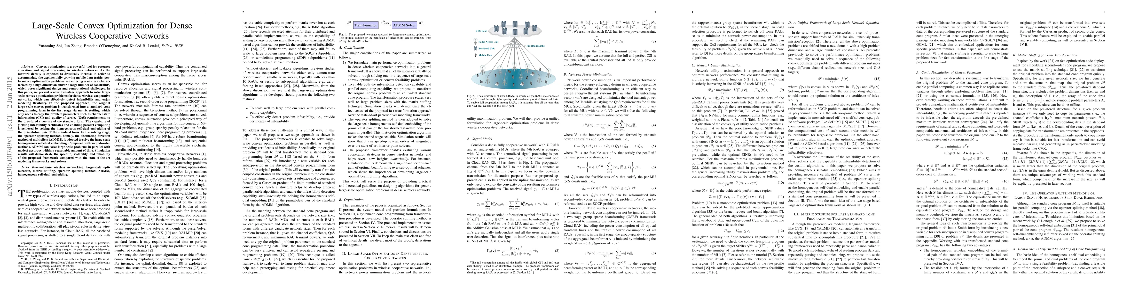 Convex optimization is a powerful tool for resource allocation and signal processing in wireless networks. As the network density is expected to drastically increase in order to accommodate the exponentially growing mobile data traffic, performance optimization problems are entering a new era characterized by a high dimension and/or a large number of constraints, which poses significant design and computational challenges. In this paper, we present a novel two-stage approach to solve large-scale convex optimization problems for dense wireless cooperative networks, which can effectively detect infeasibility and enjoy modeling flexibility. In the proposed approach, the original large-scale convex problem is transformed into a standard cone programming form in the first stage via matrix stuffing, which only needs to copy the problem parameters such as channel state information (CSI) and quality-of-service (QoS) requirements to the pre-stored structure of the standard form. The capability of yielding infeasibility certificates and enabling parallel computing is achieved by solving the homogeneous self-dual embedding of the primal-dual pair of the standard form. In the solving stage, the operator splitting method, namely, the alternating direction method of multipliers (ADMM), is adopted to solve the large-scale homogeneous self-dual embedding. Compared with second-order methods, ADMM can solve large-scale problems in parallel with modest accuracy within a reasonable amount of time. Simulation results will demonstrate the speedup, scalability, and reliability of the proposed framework compared with the state-of-the-art modeling frameworks and solvers.