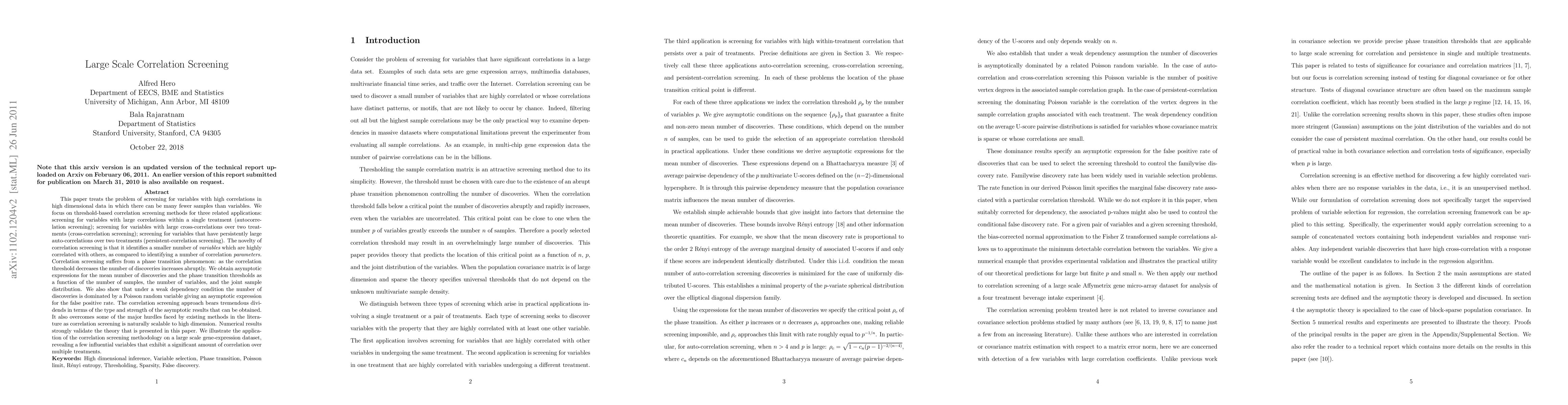 This paper treats the problem of screening for variables with high correlations in high dimensional data in which there can be many fewer samples than variables. We focus on threshold-based correlation screening methods for three related applications: screening for variables with large correlations within a single treatment (autocorrelation screening); screening for variables with large cross-correlations over two treatments (cross-correlation screening); screening for variables that have persistently large auto-correlations over two treatments (persistent-correlation screening). The novelty of correlation screening is that it identifies a smaller number of variables which are highly correlated with others, as compared to identifying a number of correlation parameters. Correlation screening suffers from a phase transition phenomenon: as the correlation threshold decreases the number of discoveries increases abruptly. We obtain asymptotic expressions for the mean number of discoveries and the phase transition thresholds as a function of the number of samples, the number of variables, and the joint sample distribution. We also show that under a weak dependency condition the number of discoveries is dominated by a Poisson random variable giving an asymptotic expression for the false positive rate. The correlation screening approach bears tremendous dividends in terms of the type and strength of the asymptotic results that can be obtained. It also overcomes some of the major hurdles faced by existing methods in the literature as correlation screening is naturally scalable to high dimension. Numerical results strongly validate the theory that is presented in this paper. We illustrate the application of the correlation screening methodology on a large scale gene-expression dataset, revealing a few influential variables that exhibit a significant amount of correlation over multiple treatments.