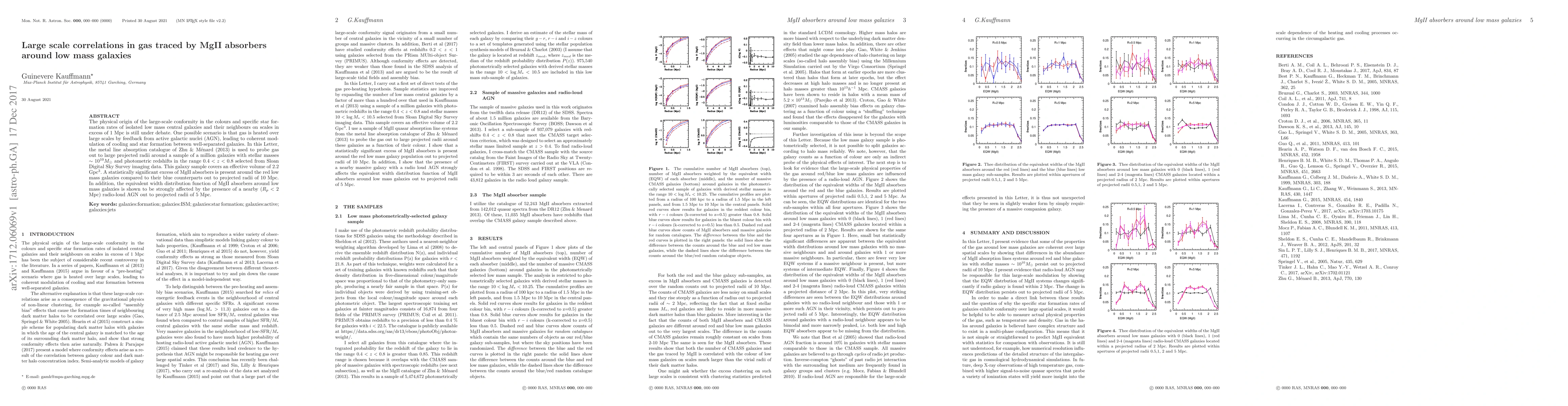 This paper investigates large-scale gas correlations traced by MgII absorbers around low mass galaxies, finding a significant excess of MgII absorbers around red, low mass galaxies compared to blue ones, suggesting AGN feedback may influence gas and star formation across large scales. The presence of nearby radio-loud AGN also affects the MgII absorber distribution, indicating a complex interplay between AGN activity and galaxy environments.