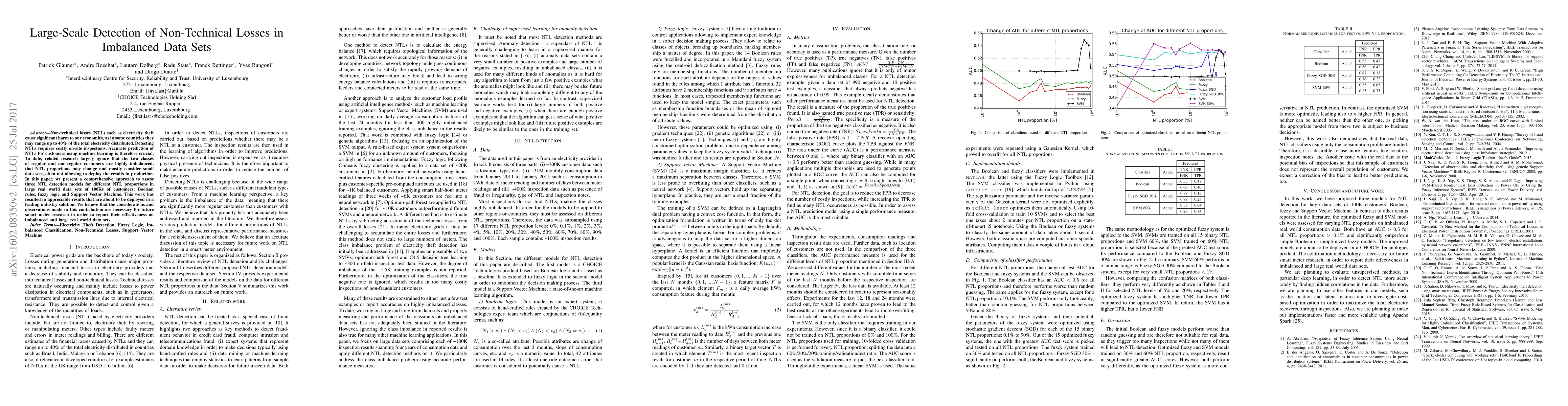 Non-technical losses (NTL) such as electricity theft cause significant harm to our economies, as in some countries they may range up to 40% of the total electricity distributed. Detecting NTLs requires costly on-site inspections. Accurate prediction of NTLs for customers using machine learning is therefore crucial. To date, related research largely ignore that the two classes of regular and non-regular customers are highly imbalanced, that NTL proportions may change and mostly consider small data sets, often not allowing to deploy the results in production. In this paper, we present a comprehensive approach to assess three NTL detection models for different NTL proportions in large real world data sets of 100Ks of customers: Boolean rules, fuzzy logic and Support Vector Machine. This work has resulted in appreciable results that are about to be deployed in a leading industry solution. We believe that the considerations and observations made in this contribution are necessary for future smart meter research in order to report their effectiveness on imbalanced and large real world data sets.