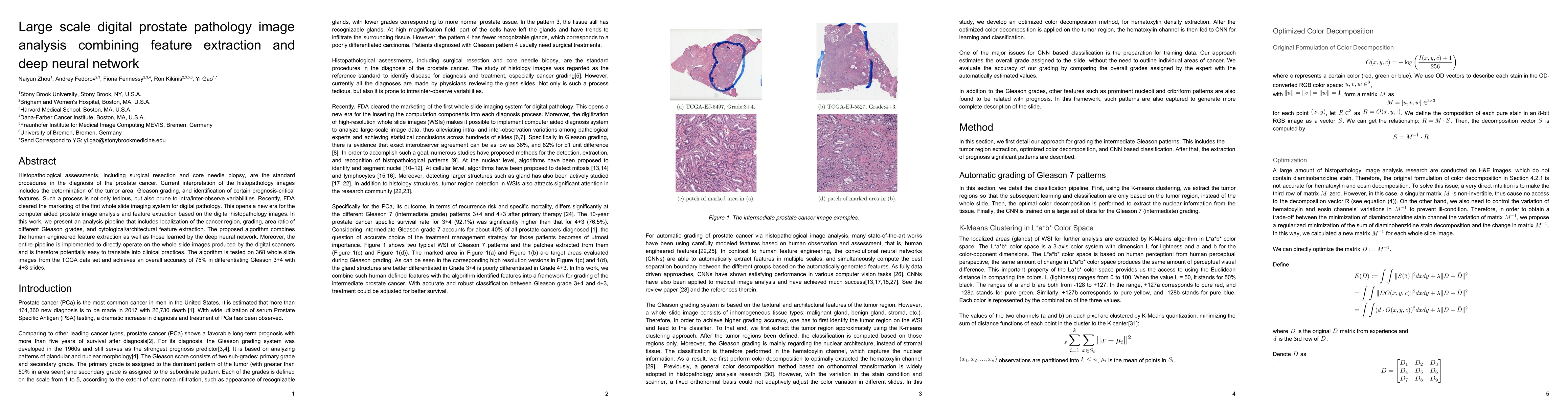 This research proposes a digital pathology analysis pipeline combining feature extraction and deep neural networks to automate prostate cancer diagnosis from whole slide images, achieving 75% accuracy in differentiating Gleason grades. The method integrates both human-engineered features and deep learning for comprehensive analysis.