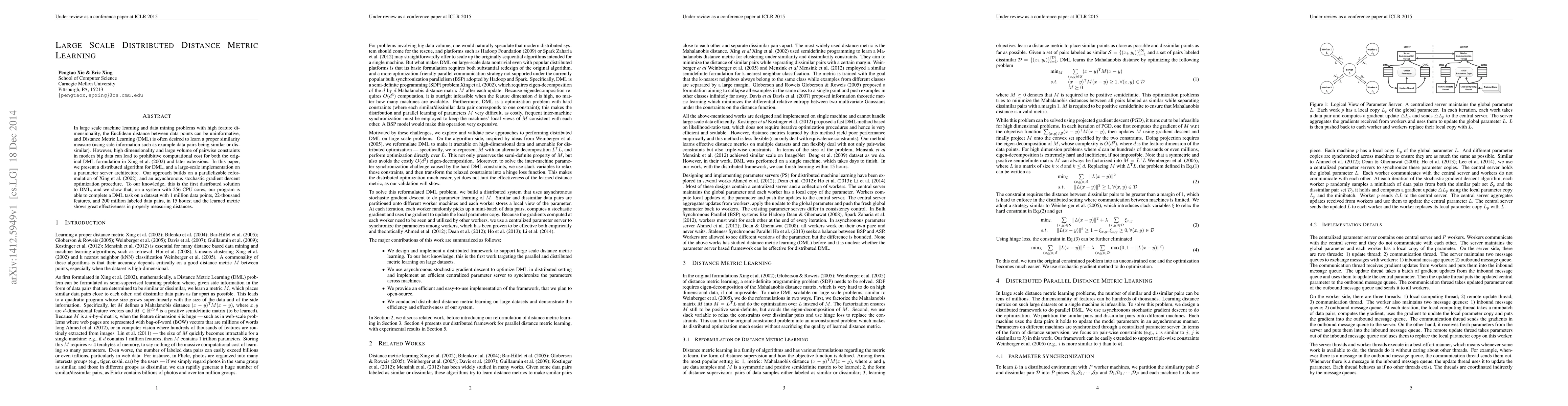 This paper introduces a distributed algorithm for large-scale distance metric learning (DML) to handle high-dimensional data efficiently. It employs a parallelizable reformulation and asynchronous stochastic gradient descent, achieving a significant reduction in computational cost for processing large datasets.