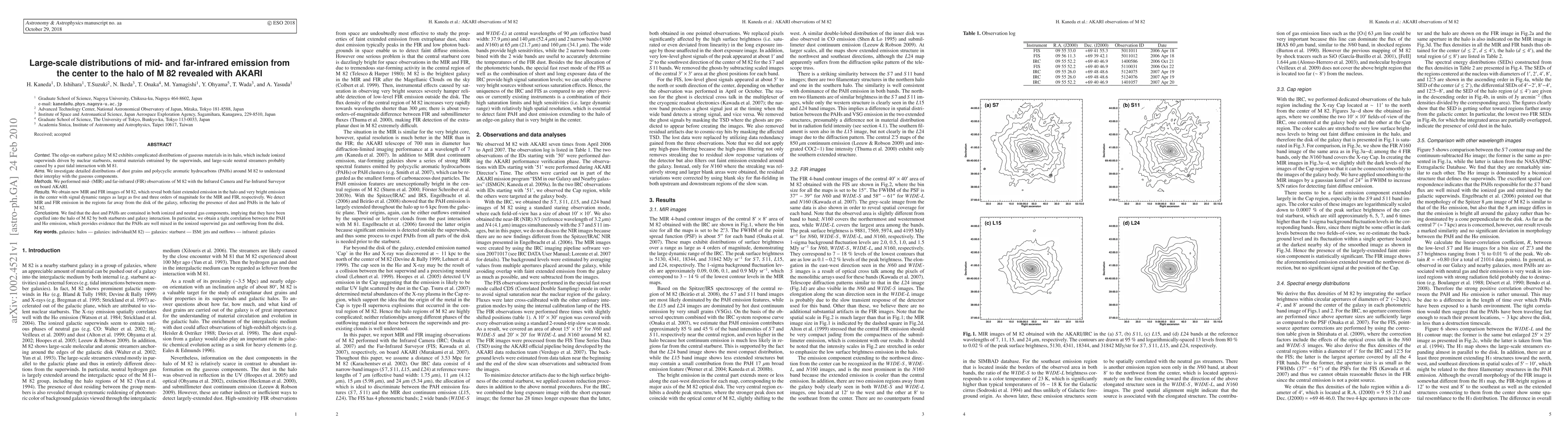 This paper uses AKARI observations to reveal detailed mid- and far-infrared emissions from M82, showing significant dust and PAH distributions in both the galaxy's center and halo, indicating their expulsion by starbursts and past tidal interactions. A strong correlation between PAH and H$\alpha$ emissions suggests PAHs are mixed within ionized superwind gas.