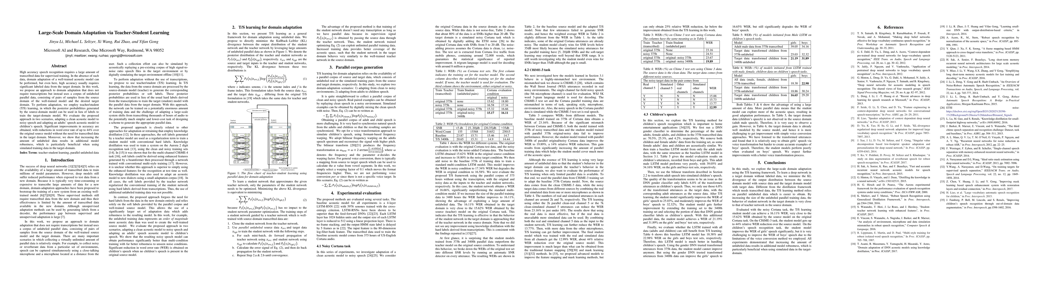 This paper proposes a teacher-student learning method for large-scale domain adaptation in speech recognition, leveraging unlabeled parallel data from source and target domains. The approach achieves significant improvements in accuracy without requiring transcribed data in the target domain, demonstrating reductions in word error rate of up to 44%.