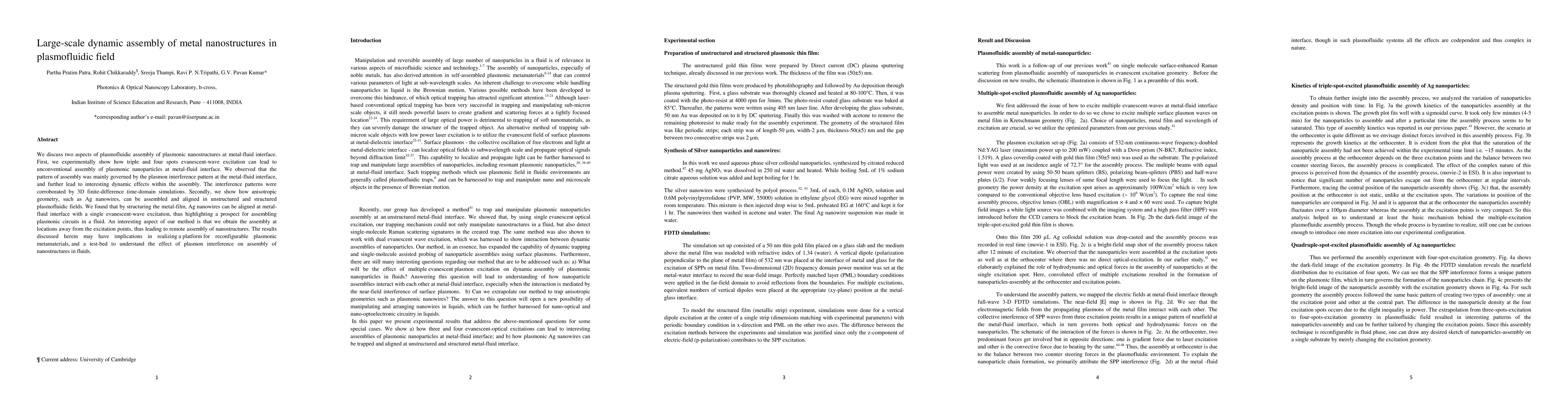 We discuss two aspects of the plasmofluidic assembly of plasmonic nanostructures at the metal fluid interface. First, we experimentally show how three and four spot evanescent wave excitation can lead to unconventional assembly of plasmonic nanoparticles at the metal fluid interface. We observed that the pattern of assembly was mainly governed by the plasmon interference pattern at the metal fluid interface, and further led to interesting dynamic effects within the assembly. The interference patterns were corroborated by 3D finite difference time domain simulations. Secondly, we show how anisotropic geometry, such as Ag nanowires, can be assembled and aligned in unstructured and structured plasmofluidic fields. We found that by structuring the metal-film, Ag nanowires can be aligned at the metal fluid interface with a single evanescent wave excitation, thus highlighting the prospect of assembling plasmonic circuits in a fluid. An interesting aspect of our method is that we obtain the assembly at locations away from the excitation points, thus leading to remote assembly of nanostructures. The results discussed herein may have implications in realizing a platform for reconfigurable plasmonic metamaterials, and a test-bed to understand the effect of plasmon interference on assembly of nanostructures in fluids.
