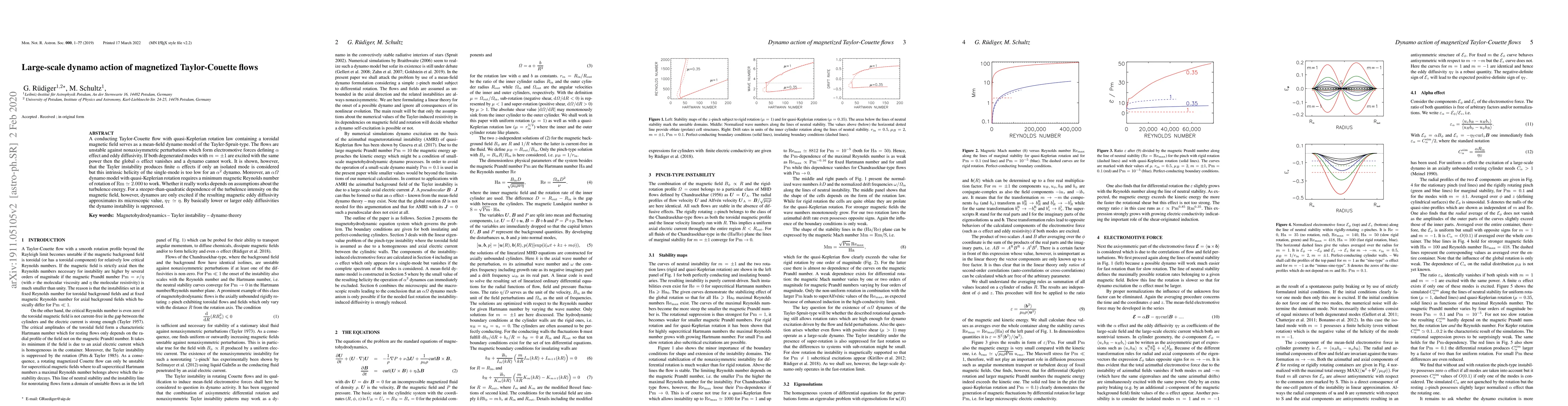 This paper explores large-scale dynamo action in magnetized Taylor-Couette flows, showing that isolated modes can produce finite $\alpha$ effects but insufficient helicity for an $\alpha^2$ dynamo. It finds that an $\alpha\Omega$ dynamo requires a minimum magnetic Reynolds number and depends on turbulence energy assumptions, with steeper magnetic field dependencies suppressing dynamo instability.