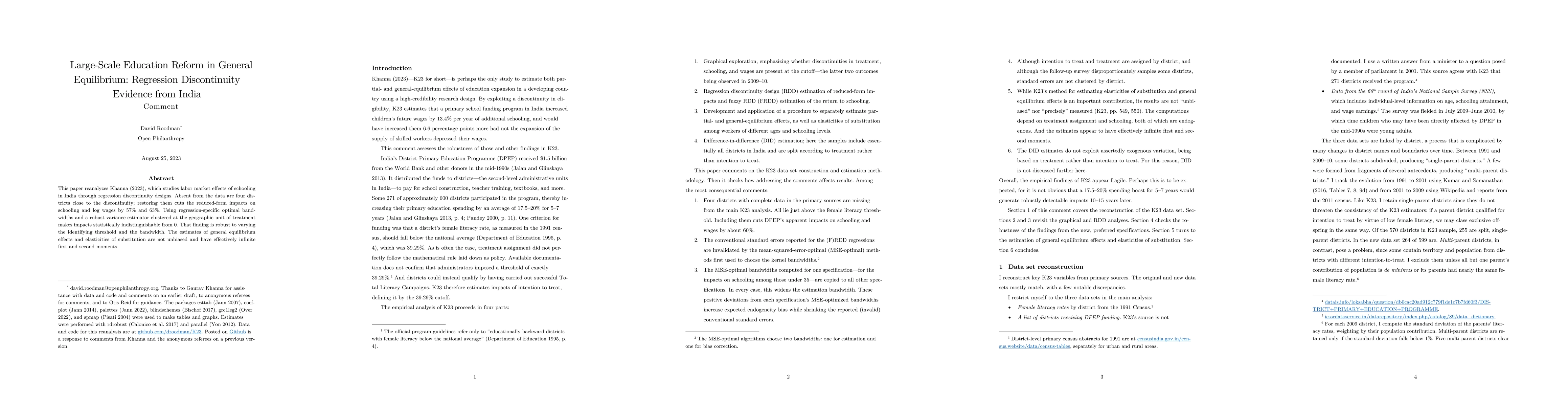 This paper reanalyzes Khanna (2023), which studies labor market effects of schooling in India through regression discontinuity designs. Absent from the data are four districts close to the discontinuity; restoring them cuts the reduced-form impacts on schooling and log wages by 57% and 63%. Using regression-specific optimal band-widths and a robust variance estimator clustered at the geographic unit of treatment makes impacts statistically indistinguishable from 0. That finding is robust to varying the identifying threshold and the bandwidth. The estimates of general equilibrium effects and elasticities of substitution are not unbiased and have effectively infinite first and second moments.