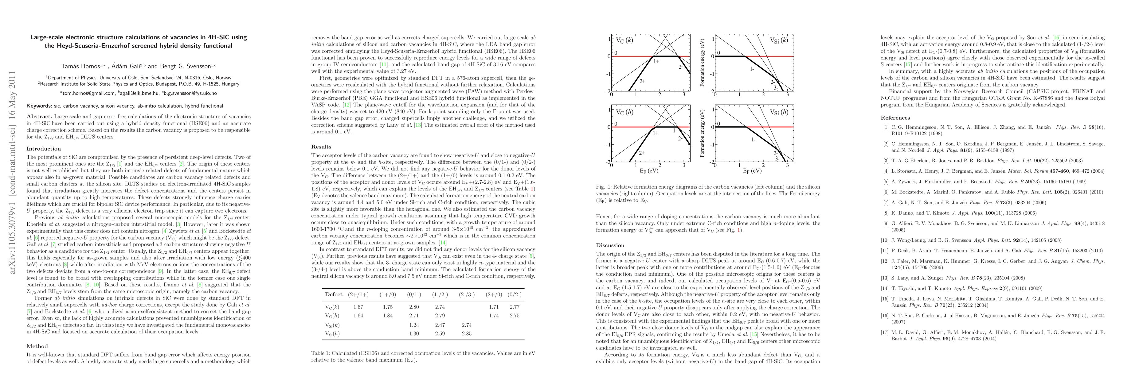 The paper presents large-scale calculations of vacancies in 4H-SiC using the HSE06 hybrid density functional. It identifies the carbon vacancy as the cause of Z1/2 and EH6/7 DLTS centers.