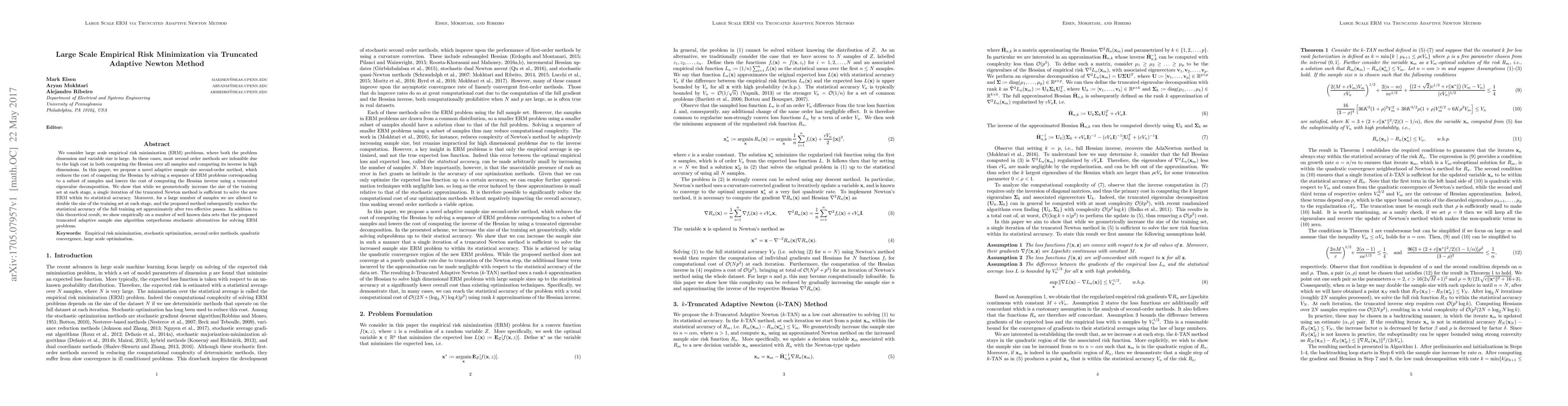 This paper proposes a novel adaptive sample size second-order method for large scale empirical risk minimization, reducing computational costs by solving ERM problems on subsets of samples and using truncated eigenvalue decomposition. The method achieves statistical accuracy with minimal iterations and outperforms stochastic alternatives on various datasets.