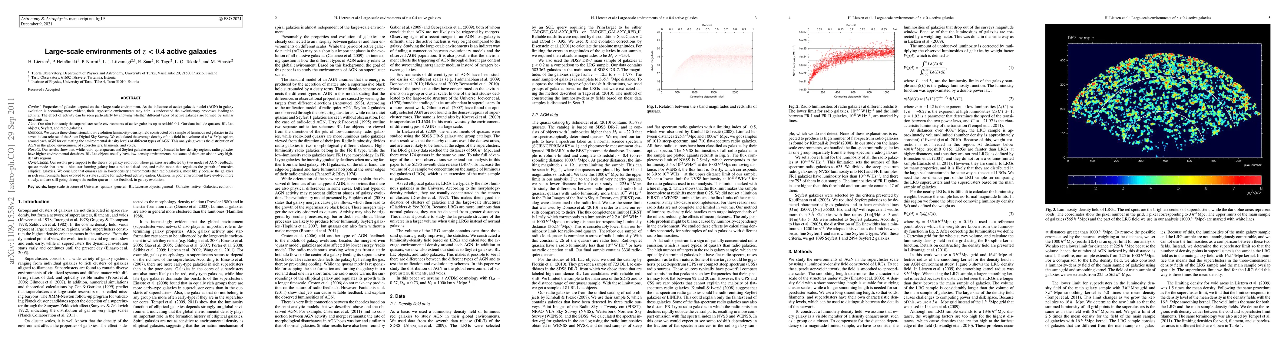 This study investigates the large-scale environments of active galaxies up to redshift 0.4, revealing that different types of active galaxies, such as quasars, BL Lac objects, Seyfert, and radio galaxies, occupy distinct environmental densities. The findings support the theory of galaxy evolution with AGN feedback, showing that quasars predominantly reside in low-density regions while radio galaxies are found in higher density environments.