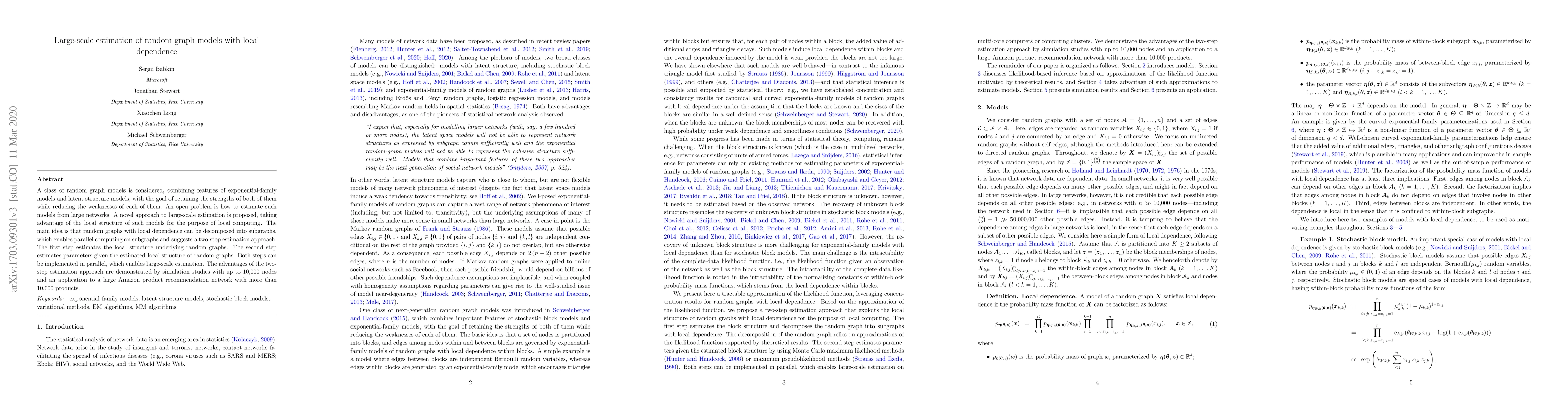 A class of random graph models is considered, combining features of exponential-family models and latent structure models, with the goal of retaining the strengths of both of them while reducing the weaknesses of each of them. An open problem is how to estimate such models from large networks. A novel approach to large-scale estimation is proposed, taking advantage of the local structure of such models for the purpose of local computing. The main idea is that random graphs with local dependence can be decomposed into subgraphs, which enables parallel computing on subgraphs and suggests a two-step estimation approach. The first step estimates the local structure underlying random graphs. The second step estimates parameters given the estimated local structure of random graphs. Both steps can be implemented in parallel, which enables large-scale estimation. The advantages of the two-step estimation approach are demonstrated by simulation studies with up to 10,000 nodes and an application to a large Amazon product recommendation network with more than 10,000 products.
