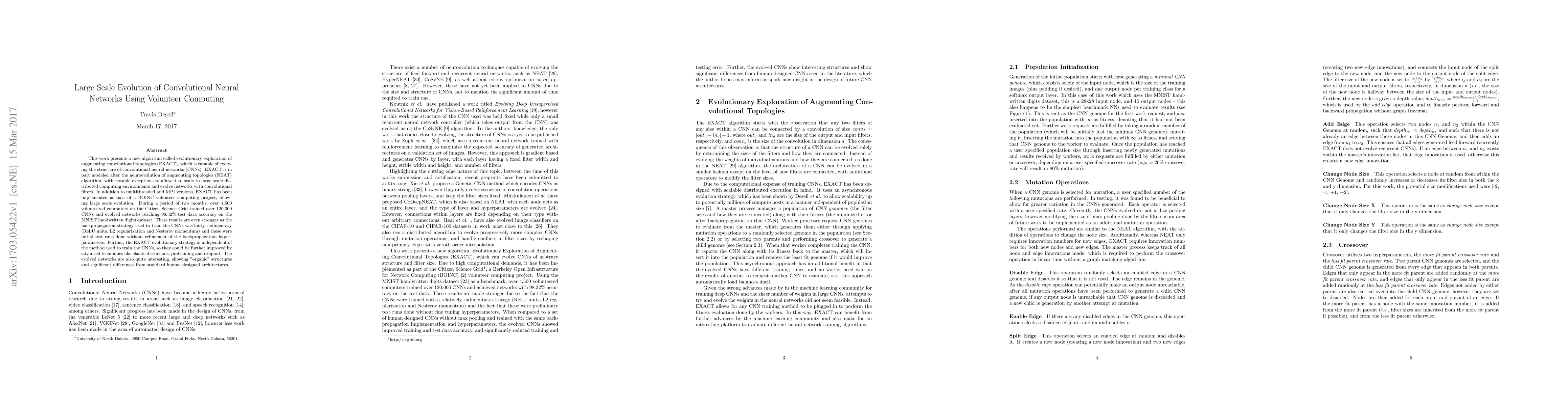 This paper introduces a new evolutionary algorithm called EXACT for scaling the evolution of convolutional neural networks (CNNs) using volunteer computing. Over two months, 4,500 volunteer computers trained 120,000 CNNs, achieving 98.32% accuracy on MNIST, demonstrating the potential of large-scale distributed evolution.