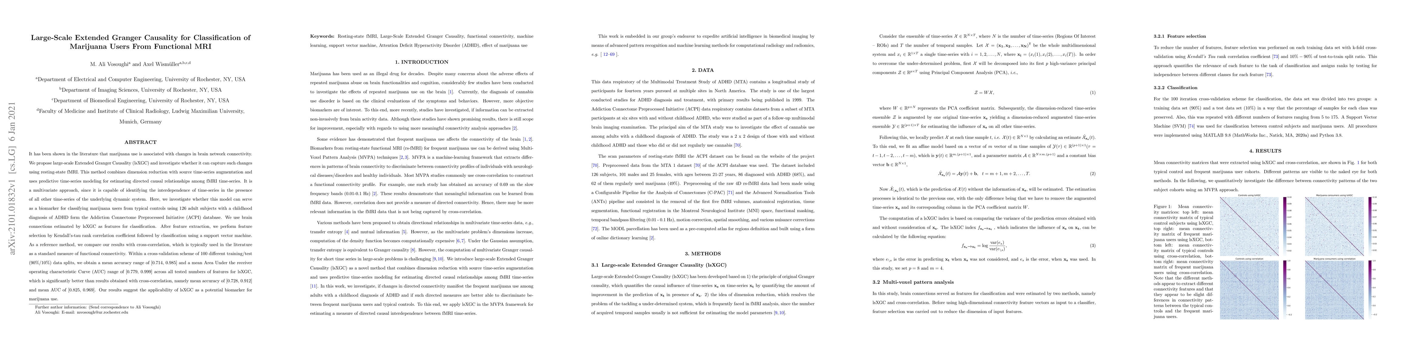 This study proposes large-scale Extended Granger Causality (lsXGC) to classify marijuana users from controls using resting-state fMRI data. The method shows superior classification accuracy and AUC compared to cross-correlation, suggesting lsXGC's potential as a biomarker for marijuana use.