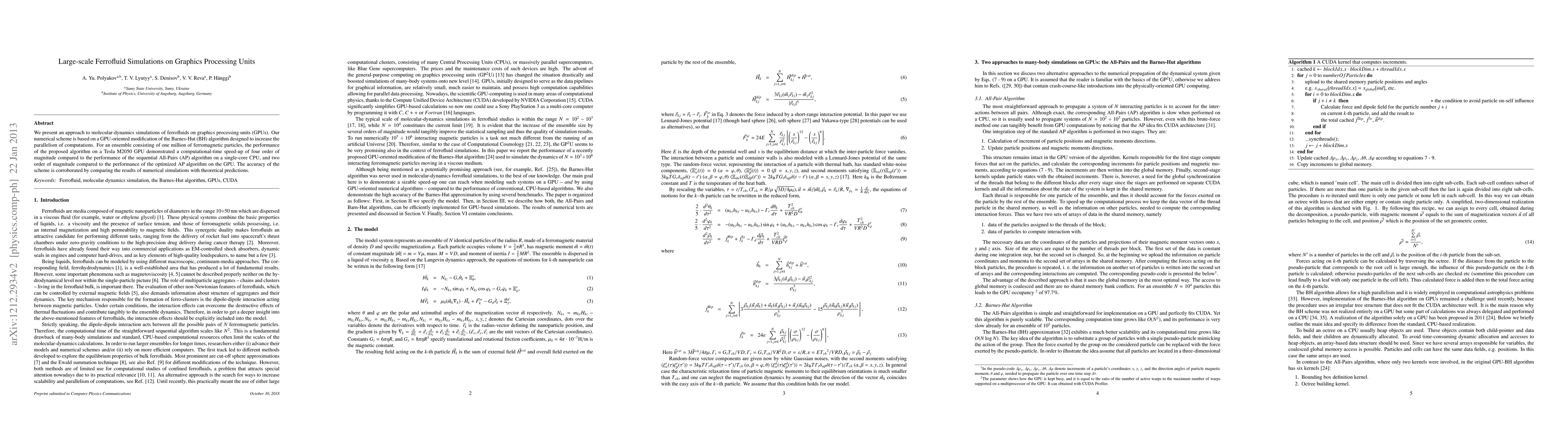 This paper proposes a GPU-optimized Barnes-Hut algorithm for large-scale ferrofluid simulations, achieving a four-order-of-magnitude speed-up over a sequential CPU-based All-Pairs algorithm, and a two-order-of-magnitude improvement over an optimized GPU All-Pairs method, while maintaining accuracy.