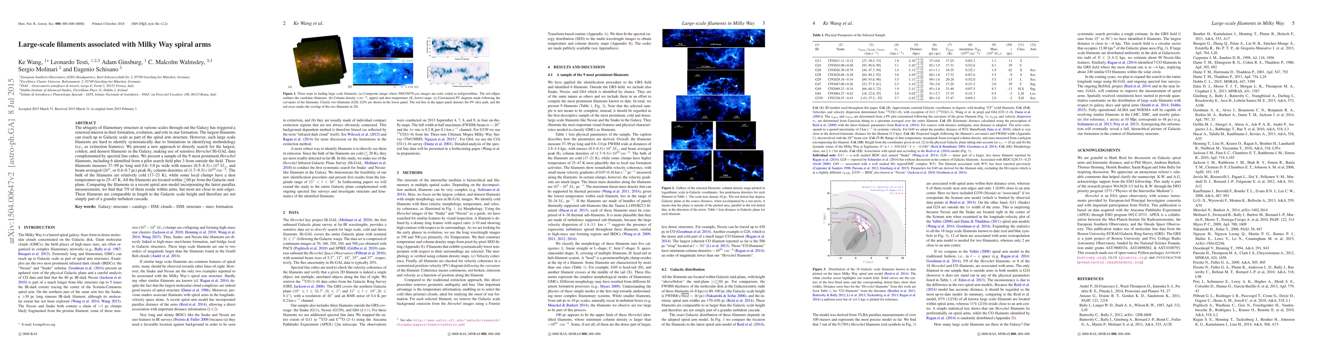 This paper presents a new method to identify large-scale filaments associated with Milky Way spiral arms using Herschel Hi-GAL data and spectral line cubes. The study identifies nine prominent filaments, measuring 37-99 pc long, with masses ranging from 0.5 to 8.3 $\times 10^4 \, M_\odot$, and located within <~60 pc from the Galactic mid-plane, mostly near the edges of spiral arms.