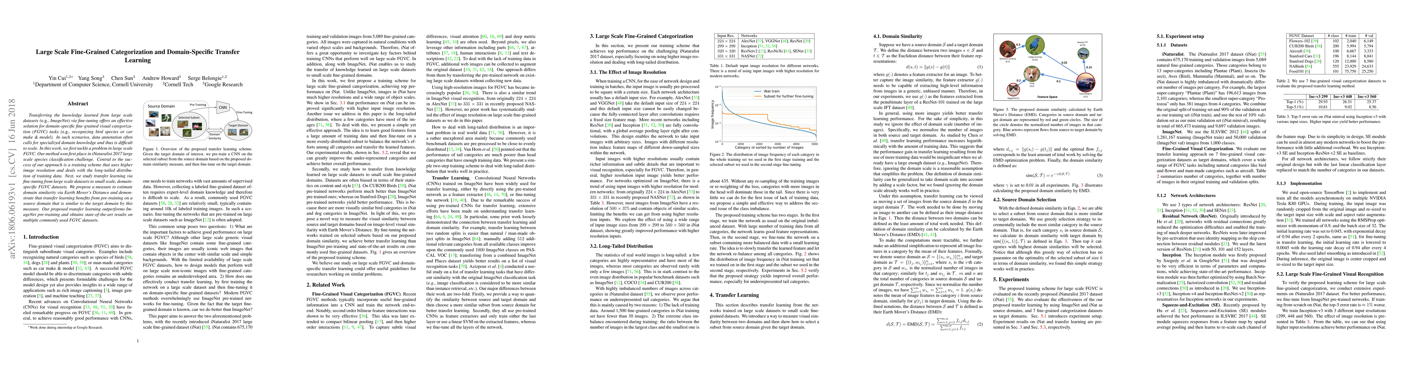This paper presents a method for large-scale fine-grained visual categorization, winning the iNaturalist 2017 challenge, and explores transfer learning from large-scale datasets to domain-specific tasks. It proposes a training scheme that leverages high-resolution images and addresses the long-tailed data distribution, achieving state-of-the-art results through improved transfer learning using domain similarity measures.