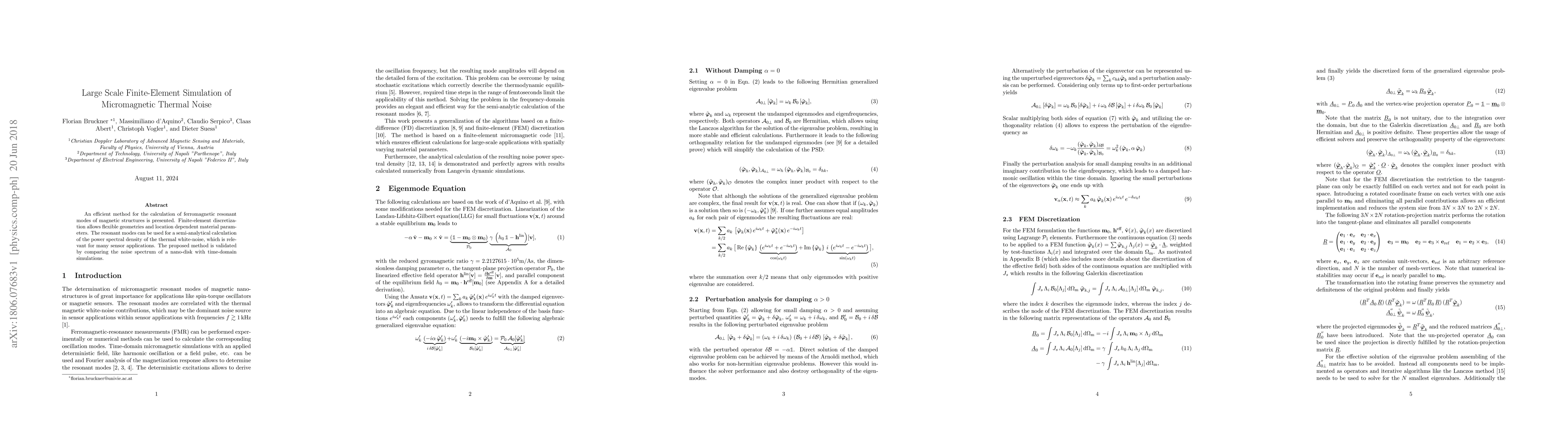 This paper presents a large-scale finite-element simulation method for calculating ferromagnetic resonant modes in magnetic structures, enabling flexible geometries and material parameters. The method is validated by comparing the thermal noise spectrum of a nano-disk with time-domain simulations, demonstrating its relevance for sensor applications.