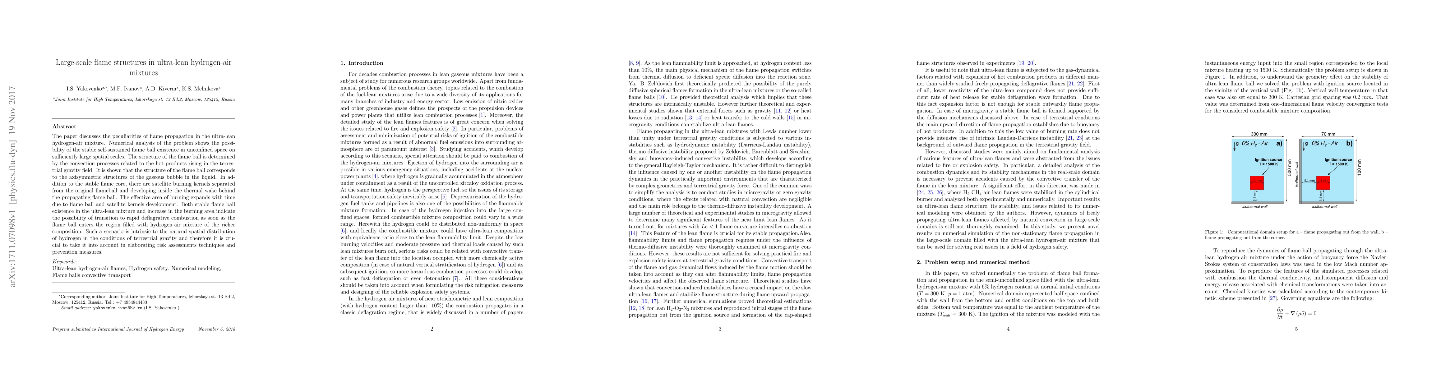 This paper explores the stable self-sustained flame ball formation in ultra-lean hydrogen-air mixtures, revealing its axisymmetric structure and the presence of satellite burning kernels. The findings suggest potential rapid combustion transition in richer mixtures, highlighting the importance of considering this in risk assessments and prevention measures.
