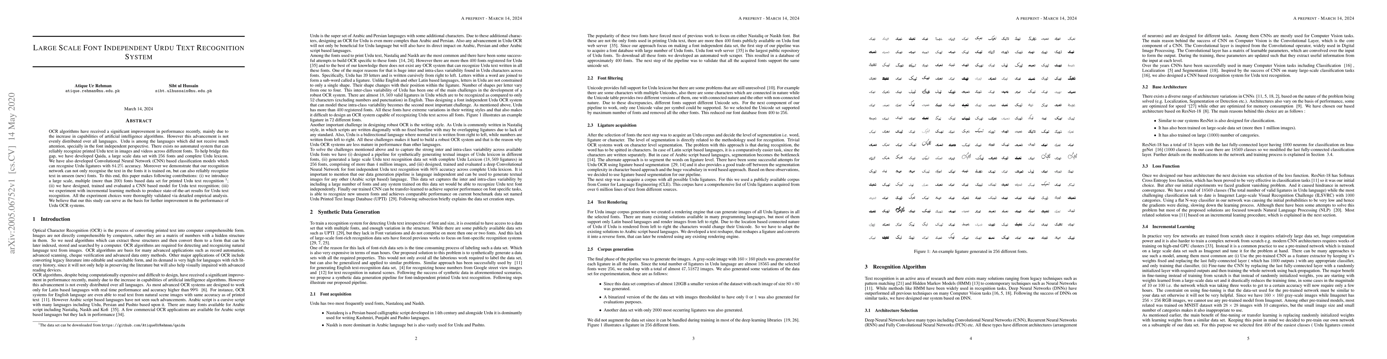 This paper develops Qaida, a large-scale dataset with 256 fonts and a CNN-based model achieving 84.2% accuracy for font-independent Urdu text recognition, showcasing its capability to recognize unseen fonts and proposing it as a foundation for future improvements in Urdu OCR systems.
