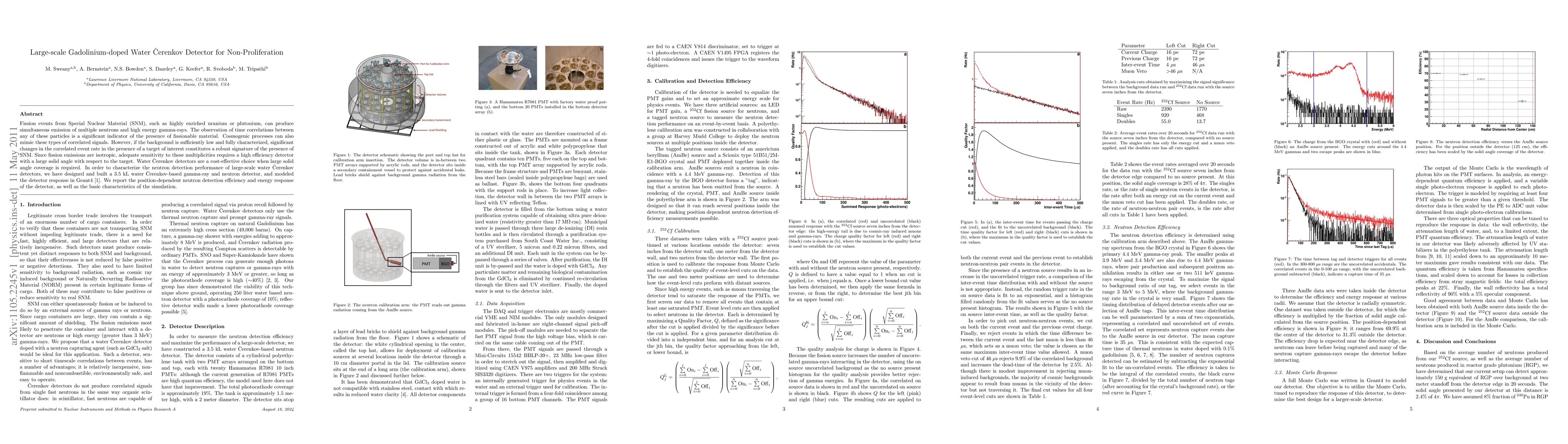 This paper describes the development of a large-scale gadolinium-doped water Cerenkov detector for detecting fission events from Special Nuclear Material, emphasizing its high efficiency and large solid angle coverage. The study reports on the neutron detection performance and energy response of the detector, along with simulation results using Geant4.