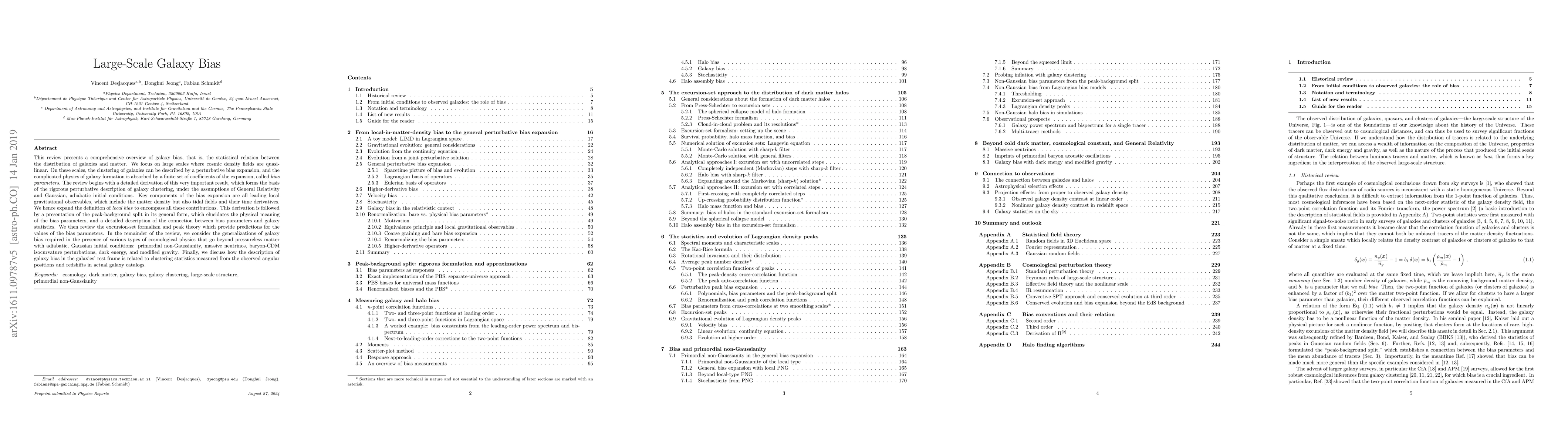 This review comprehensively explores galaxy bias, detailing the statistical relation between galaxy and matter distributions on large scales. It derives the perturbative bias expansion, linking galaxy clustering to gravitational observables, and discusses the implications of various cosmological physics beyond standard models.
