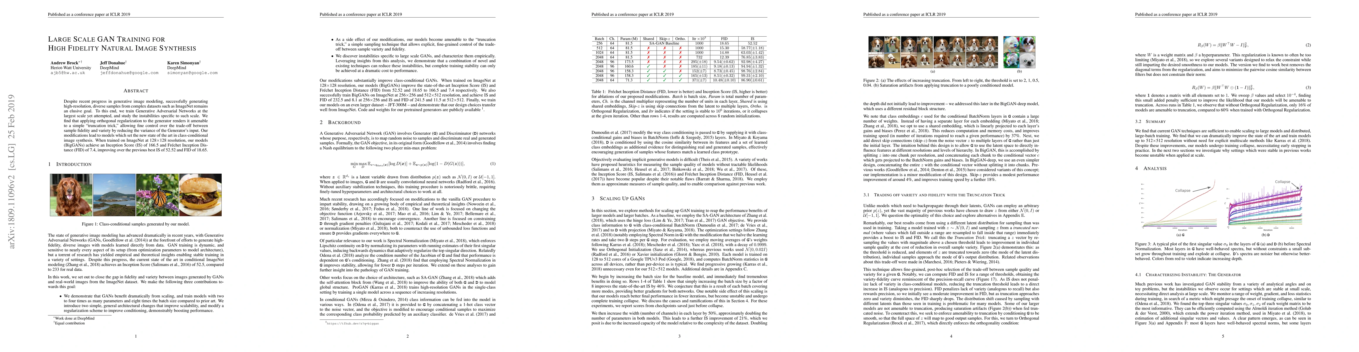 Researchers trained a large Generative Adversarial Network to synthesize high-fidelity natural images at 128x128 resolution, achieving state-of-the-art results with an Inception Score of 166.5 and Frechet Inception Distance of 7.4.