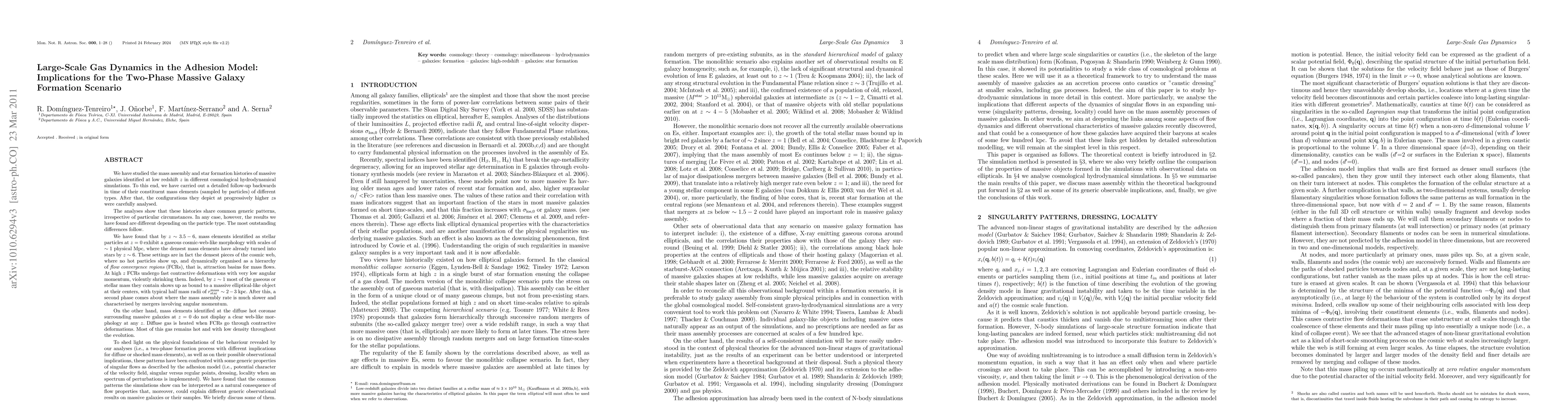 The mass assembly and star formation histories of massive galaxies identified at low redshift z in different cosmological hydrodynamical simulations, have been studied through a detailed follow-up backwards in time of their constituent mass elements (sampled by particles) of different types. Then, the configurations they depict at progressively higher zs have been analysed. The analyses show that these histories share common generic patterns, irrespective of particular circumstances. In any case, the results we have found are different depending on the particle type. The most outstanding differences follow. We have found that by z ~ 3.5 - 6, mass elements identified as stellar particles at z=0 exhibit a gaseous cosmic-web-like morphology with scales of ~ 1 physical Mpc, where the densest mass elements have already turned into stars by z ~ 6. These settings are in fact the densest pieces of the cosmic web, where no hot particles show up, and dynamically organized as a hierarchy of flow convergence regions, that is, attraction basins for mass flows. On the other hand, mass elements identified at the diffuse hot coronae surrounding massive galaxies at z = 0, do not display a clear web-like morphology at any z. Diffuse gas is heated when flow convergence regions go through contractive deformations, and most of it keeps hot and with low density along the evolution. To shed light on the physical foundations of the behaviour our analyses show up, as well as on their possible observational implications, these patterns have been confronted with some generic properties of singular flows as described by the adhesion model. We have found that these common patterns simulations show can be interpreted as a consequence of flow properties, that, moreover, could explain different generic observational results on massive galaxies or their samples. We briefly discuss some of them.[Abridged]