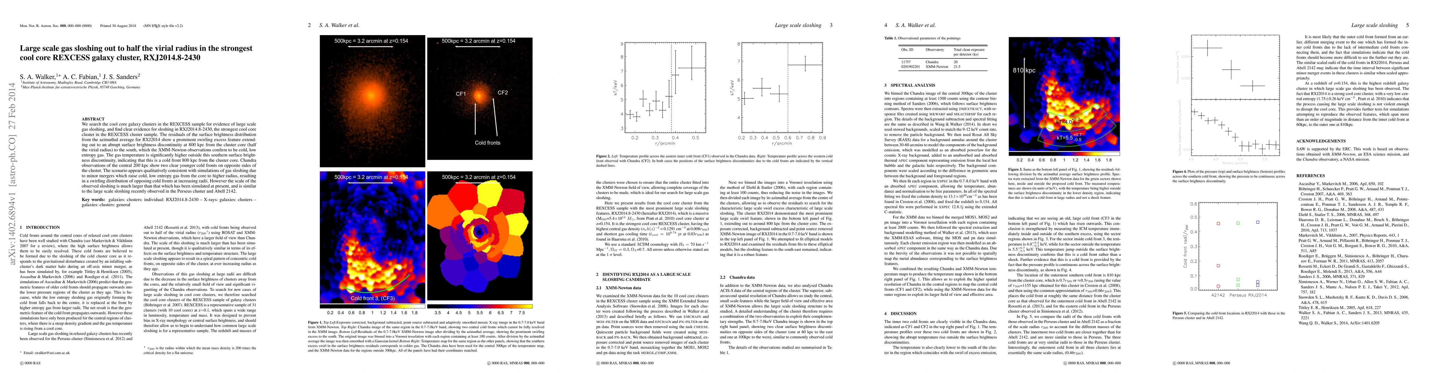 We search the cool core galaxy clusters in the REXCESS sample for evidence of large scale gas sloshing, and find clear evidence for sloshing in RXJ2014.8-2430, the strongest cool core cluster in the REXCESS cluster sample. The residuals of the surface brightness distribution from the azimuthal average for RXJ2014 show a prominent swirling excess feature extending out to an abrupt surface brightness discontinuity at 800 kpc from the cluster core (half the virial radius) to the south, which the XMM-Newton observations confirm to be cold, low entropy gas. The gas temperature is significantly higher outside this southern surface brightness discontinuity, indicating that this is a cold front 800 kpc from the cluster core. Chandra observations of the central 200 kpc show two clear younger cold fronts on opposite sides of the cluster. The scenario appears qualitatively consistent with simulations of gas sloshing due to minor mergers which raise cold, low entropy gas from the core to higher radius, resulting in a swirling distribution of opposing cold fronts at increasing radii. However the scale of the observed sloshing is much larger than that which has been simulated at present, and is similar to the large scale sloshing recently observed in the Perseus cluster and Abell 2142.
