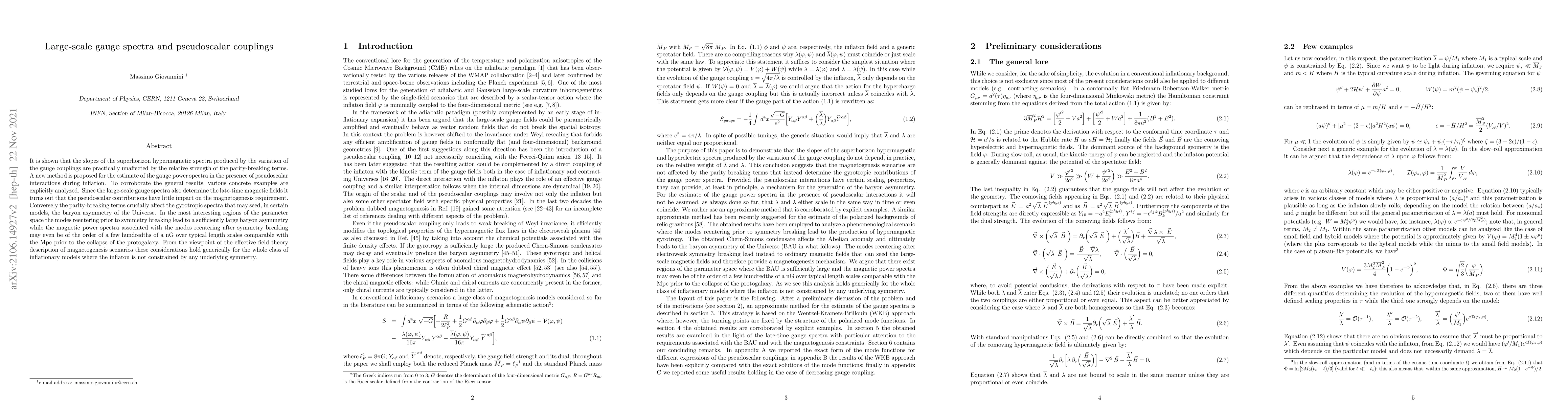 It is shown that the slopes of the superhorizon hypermagnetic spectra produced by the variation of the gauge couplings are practically unaffected by the relative strength of the parity-breaking terms. A new method is proposed for the estimate of the gauge power spectra in the presence of pseudoscalar interactions during inflation. To corroborate the general results, various concrete examples are explicitly analyzed. Since the large-scale gauge spectra also determine the late-time magnetic fields it turns out that the pseudoscalar contributions have little impact on the magnetogenesis requirement. Conversely the parity-breaking terms crucially affect the gyrotropic spectra that may seed, in certain models, the baryon asymmetry of the Universe. In the most interesting regions of the parameter space the modes reentering prior to symmetry breaking lead to a sufficiently large baryon asymmetry while the magnetic power spectra associated with the modes reentering after symmetry breaking may even be of the order of a few hundredths of a nG over typical length scales comparable with the Mpc prior to the collapse of the protogalaxy. From the viewpoint of the effective field theory description of magnetogenesis scenarios these considerations hold generically for the whole class of inflationary models where the inflaton is not constrained by any underlying symmetry.