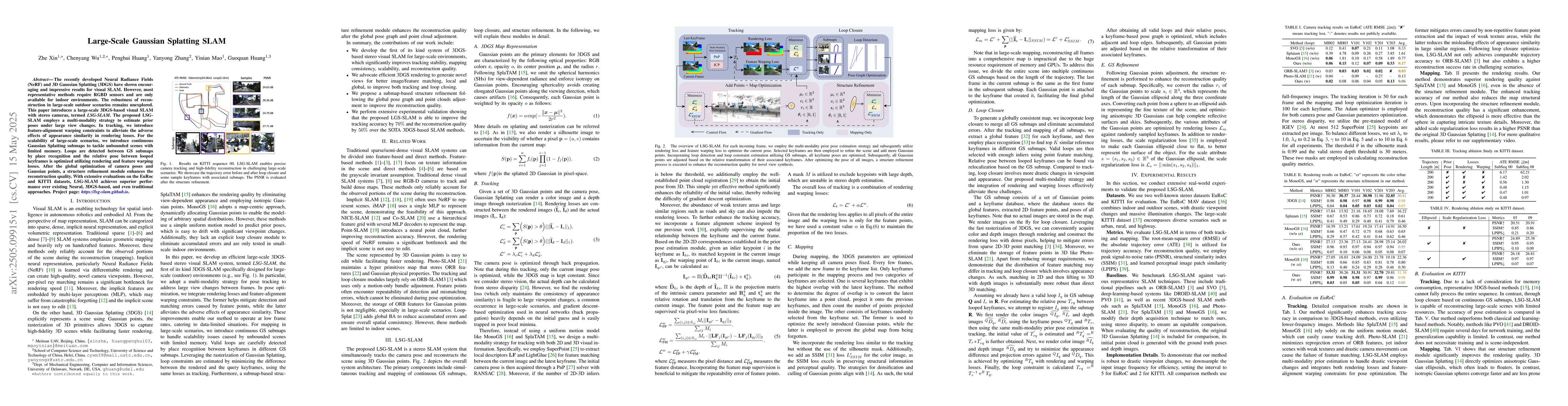 The paper proposes LSG-SLAM, a large-scale 3D Gaussian Splatting-based visual SLAM system using stereo cameras. It incorporates a multi-modality strategy for prior pose estimation under large view changes, feature-alignment warping constraints to mitigate appearance similarity in rendering losses, and continuous Gaussian Splatting submaps for scalability in unbounded scenes with limited memory.