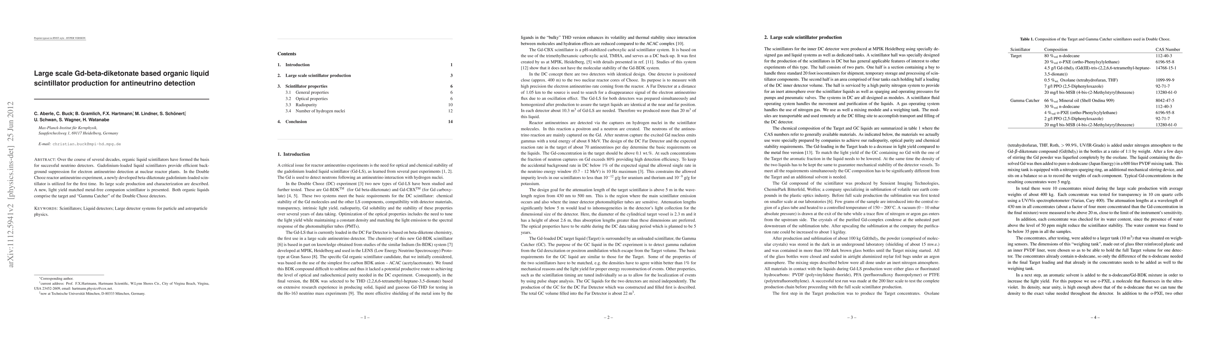 This paper details the large-scale production of a novel Gd-beta-diketonate based organic liquid scintillator for antineutrino detection, emphasizing its use in the Double Chooz experiment for efficient background suppression. A new metal-free companion scintillator is also introduced, both designed to enhance detection capabilities.
