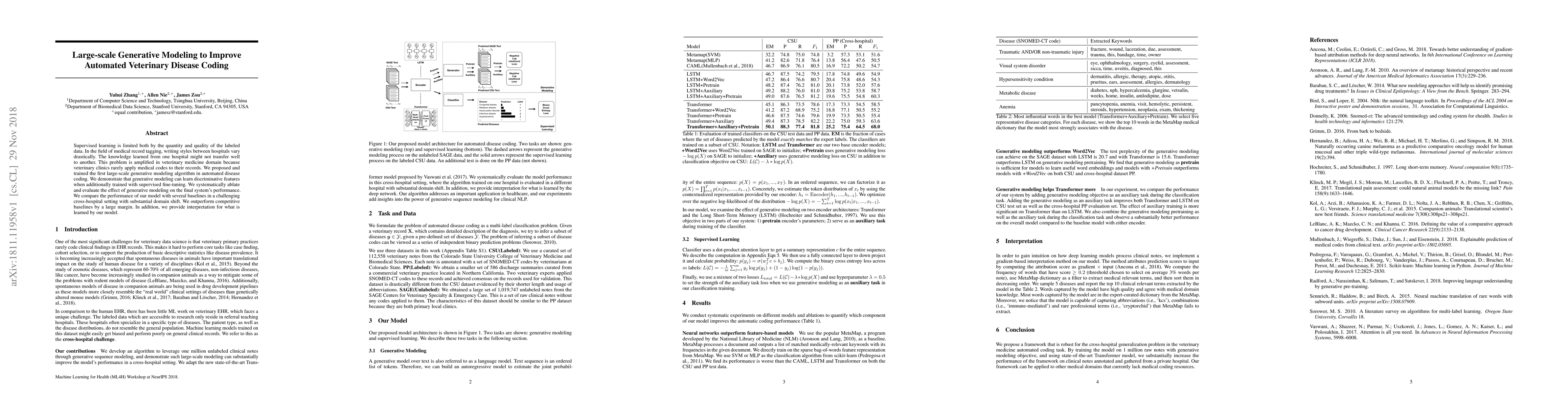 Supervised learning is limited both by the quantity and quality of the labeled data. In the field of medical record tagging, writing styles between hospitals vary drastically. The knowledge learned from one hospital might not transfer well to another. This problem is amplified in veterinary medicine domain because veterinary clinics rarely apply medical codes to their records. We proposed and trained the first large-scale generative modeling algorithm in automated disease coding. We demonstrate that generative modeling can learn discriminative features when additionally trained with supervised fine-tuning. We systematically ablate and evaluate the effect of generative modeling on the final system's performance. We compare the performance of our model with several baselines in a challenging cross-hospital setting with substantial domain shift. We outperform competitive baselines by a large margin. In addition, we provide interpretation for what is learned by our model.