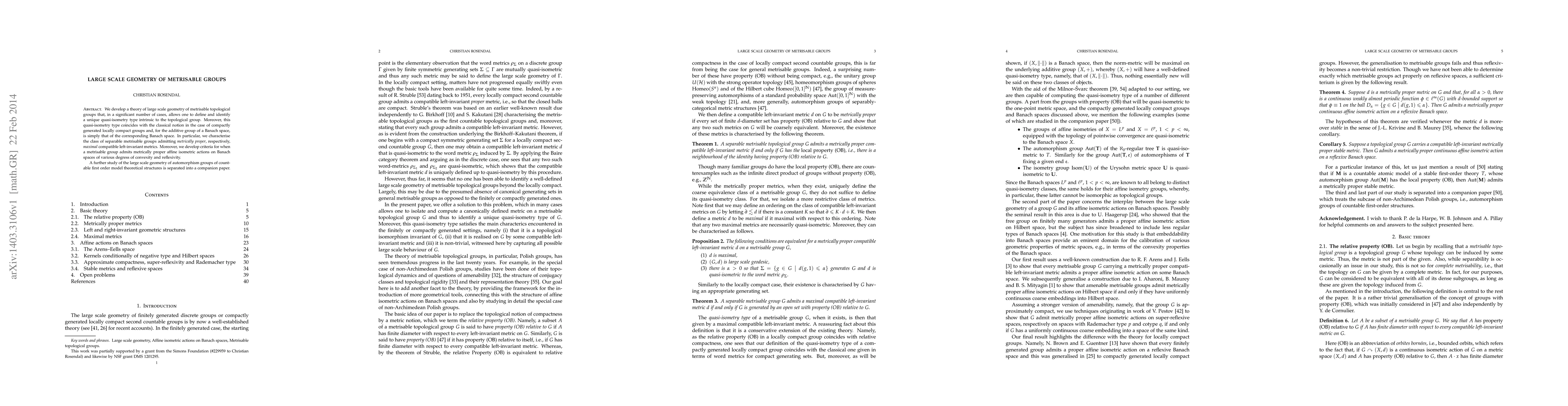 This paper develops a theory of large scale geometry for metrisable topological groups, identifying a unique quasi-isometry type intrinsic to these groups, which aligns with classical notions for compactly generated locally compact groups and Banach spaces. It also characterizes separable metrisable groups with metrically proper and maximal compatible left-invariant metrics, and explores affine isometric actions on Banach spaces.