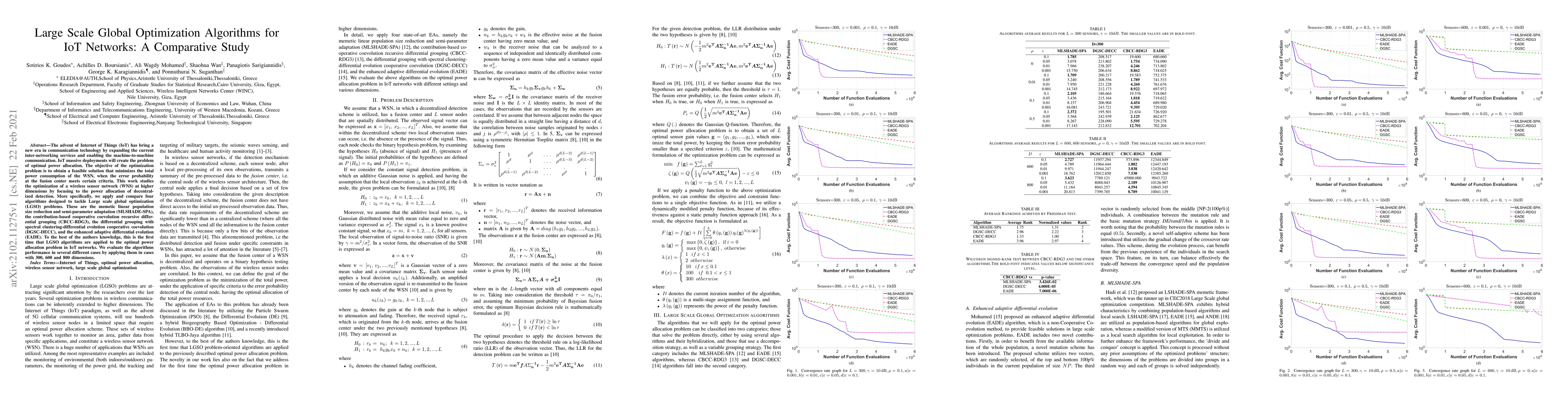 The advent of Internet of Things (IoT) has bring a new era in communication technology by expanding the current inter-networking services and enabling the machine-to-machine communication. IoT massive deployments will create the problem of optimal power allocation. The objective of the optimization problem is to obtain a feasible solution that minimizes the total power consumption of the WSN, when the error probability at the fusion center meets certain criteria. This work studies the optimization of a wireless sensor network (WNS) at higher dimensions by focusing to the power allocation of decentralized detection. More specifically, we apply and compare four algorithms designed to tackle Large scale global optimization (LGSO) problems. These are the memetic linear population size reduction and semi-parameter adaptation (MLSHADE-SPA), the contribution-based cooperative coevolution recursive differential grouping (CBCC-RDG3), the differential grouping with spectral clustering-differential evolution cooperative coevolution (DGSC-DECC), and the enhanced adaptive differential evolution (EADE). To the best of the authors knowledge, this is the first time that LGSO algorithms are applied to the optimal power allocation problem in IoT networks. We evaluate the algorithms performance in several different cases by applying them in cases with 300, 600 and 800 dimensions.