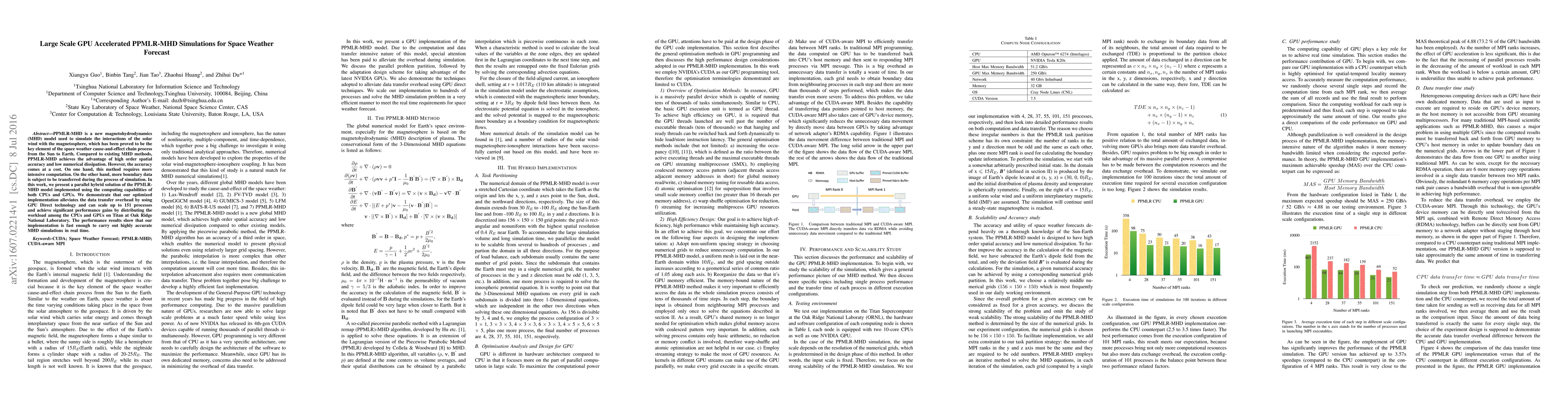 PPMLR-MHD is a new magnetohydrodynamics (MHD) model used to simulate the interactions of the solar wind with the magnetosphere, which has been proved to be the key element of the space weather cause-and-effect chain process from the Sun to Earth. Compared to existing MHD methods, PPMLR-MHD achieves the advantage of high order spatial accuracy and low numerical dissipation. However, the accuracy comes at a cost. On one hand, this method requires more intensive computation. On the other hand, more boundary data is subject to be transferred during the process of simulation.s In this work, we present a parallel hybrid solution of the PPMLR-MHD model implemented using the computing capabilities of both CPUs and GPUs. We demonstrate that our optimized implementation alleviates the data transfer overhead by using GPU Direct technology and can scale up to 151 processes and achieve significant performance gains by distributing the workload among the CPUs and GPUs on Titan at Oak Ridge National Laboratory. The performance results show that our implementation is fast enough to carry out highly accurate MHD simulations in real time.