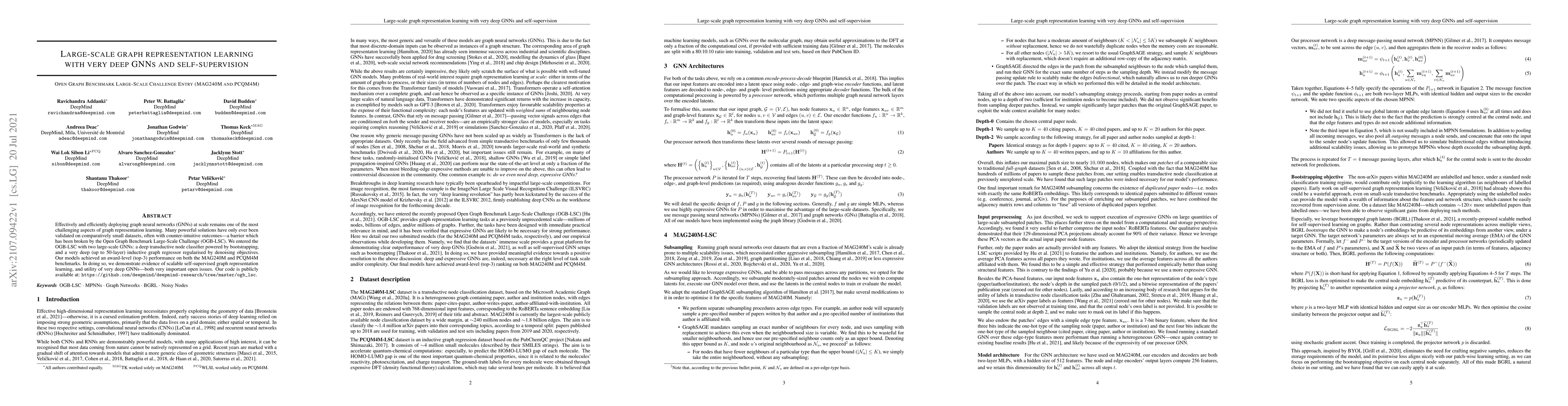 Effectively and efficiently deploying graph neural networks (GNNs) at scale remains one of the most challenging aspects of graph representation learning. Many powerful solutions have only ever been validated on comparatively small datasets, often with counter-intuitive outcomes -- a barrier which has been broken by the Open Graph Benchmark Large-Scale Challenge (OGB-LSC). We entered the OGB-LSC with two large-scale GNNs: a deep transductive node classifier powered by bootstrapping, and a very deep (up to 50-layer) inductive graph regressor regularised by denoising objectives. Our models achieved an award-level (top-3) performance on both the MAG240M and PCQM4M benchmarks. In doing so, we demonstrate evidence of scalable self-supervised graph representation learning, and utility of very deep GNNs -- both very important open issues. Our code is publicly available at: https://github.com/deepmind/deepmind-research/tree/master/ogb_lsc.