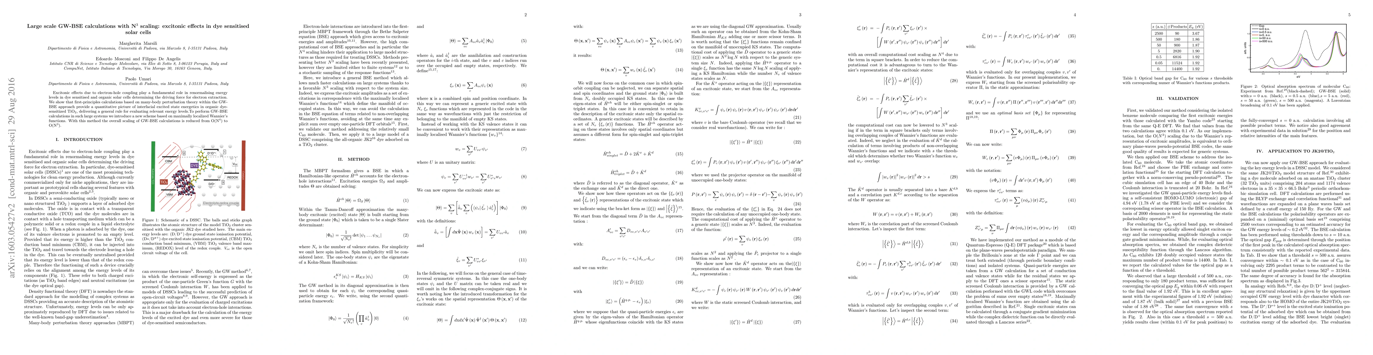This paper presents first-principles GW-BSE calculations to quantitatively analyze excitonic effects in dye-sensitized solar cells, revealing the role of electron-hole coupling in energy level renormalization. A new scheme based on maximally localized Wannier functions reduces the computational complexity from O(N^4) to O(N^3), enabling large-scale GW-BSE calculations.