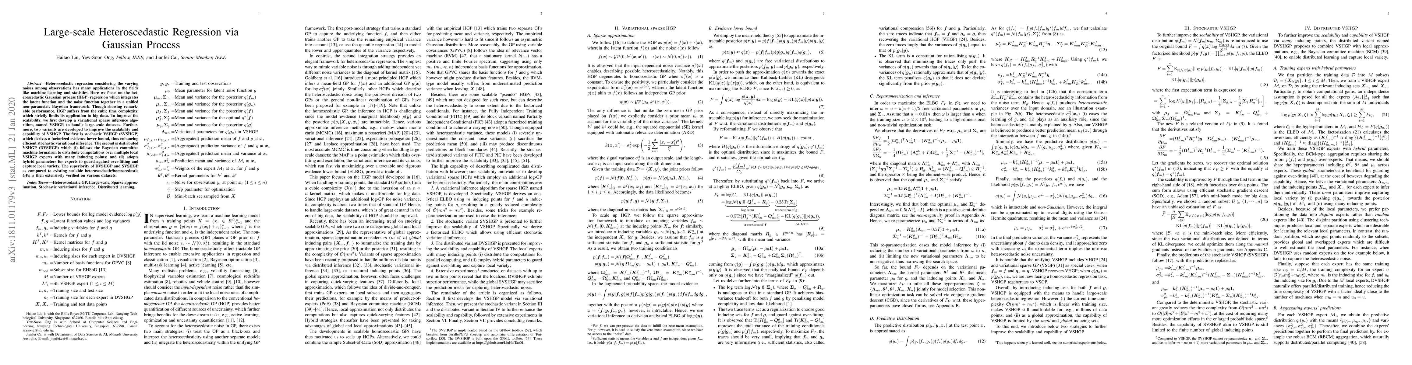 This paper proposes scalable methods for large-scale heteroscedastic Gaussian process regression, addressing the cubic time complexity issue. The developed variational sparse inference algorithm, along with its stochastic and distributed variants, significantly enhances efficiency and performance for big data applications.