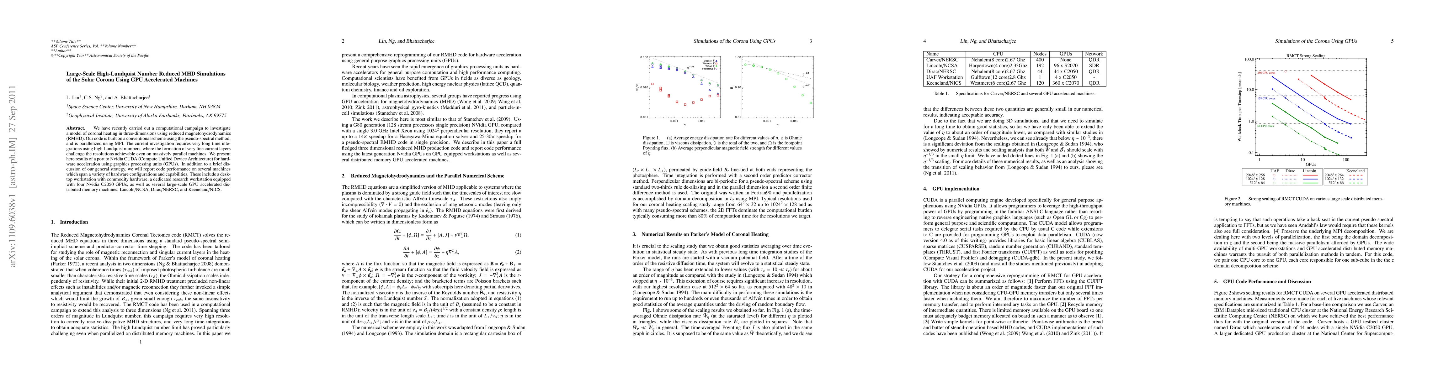 We have recently carried out a computational campaign to investigate a model of coronal heating in three-dimensions using reduced magnetohydrodynamics (RMHD). Our code is built on a conventional scheme using the pseudo-spectral method, and is parallelized using MPI. The current investigation requires very long time integrations using high Lundquist numbers, where the formation of very fine current layers challenge the resolutions achievable even on massively parallel machines. We present here results of a port to Nvidia CUDA (Compute Unified Device Architecture) for hardware acceleration using graphics processing units (GPUs). In addition to a brief discussion of our general strategy, we will report code performance on several machines which span a variety of hardware configurations and capabilities. These include a desktop workstation with commodity hardware, a dedicated research workstation equipped with four Nvidia C2050 GPUs, as well as several large-scale GPU accelerated distributed memory machines: Lincoln/NCSA, Dirac/NERSC, and Keeneland/NICS.