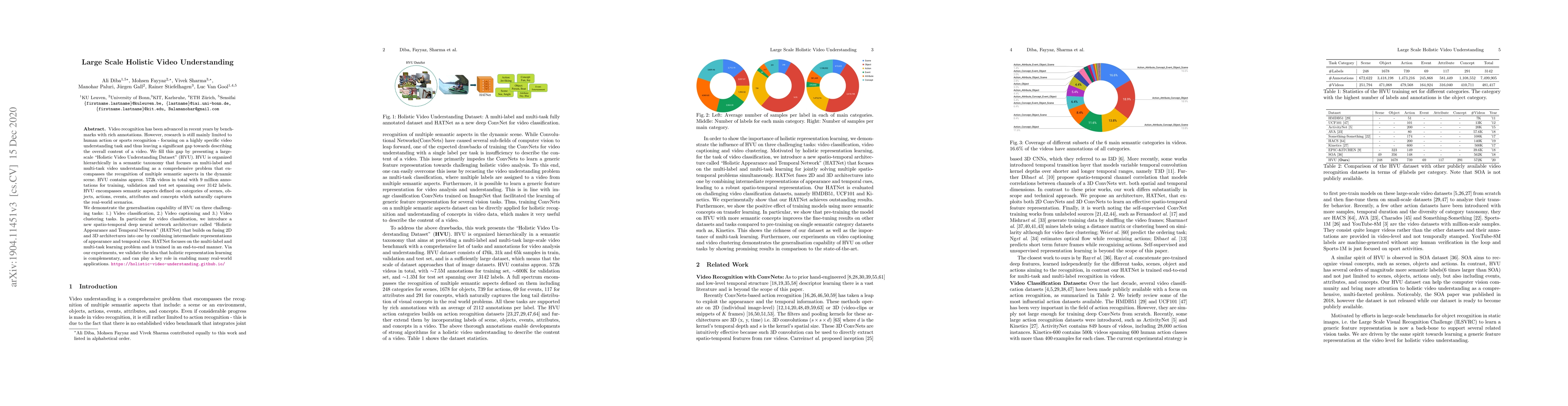This paper introduces a large-scale "Holistic Video Understanding Dataset" (HVU) with 572k videos and 9 million annotations across 3142 labels, aiming to comprehensively describe video content. The study demonstrates the dataset's effectiveness through three tasks: video classification, video captioning, and video clustering, using a new spatio-temporal network architecture called HATNet.