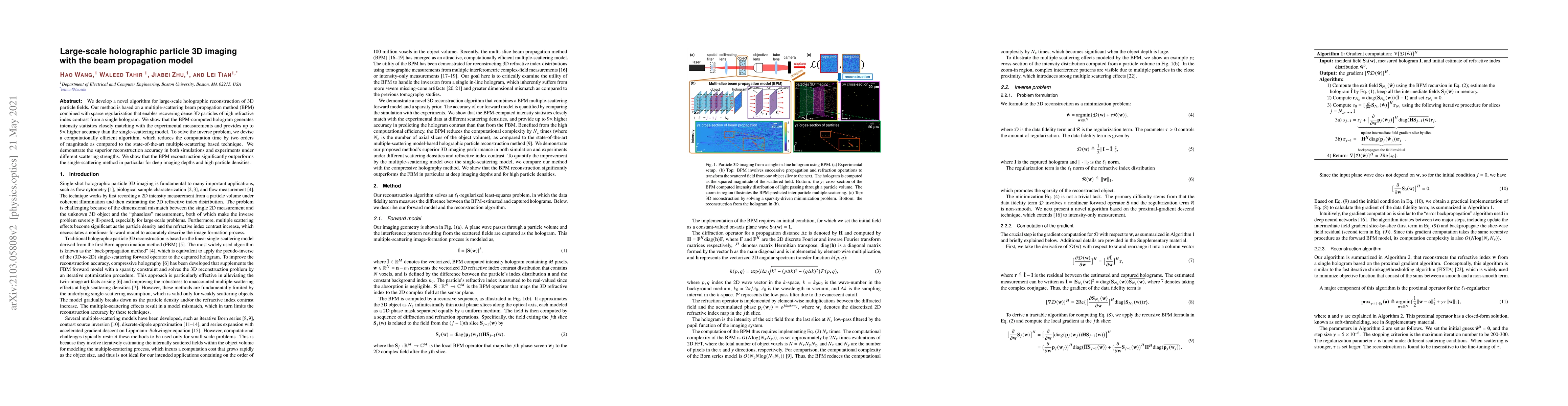This paper introduces a novel algorithm for large-scale holographic reconstruction of 3D particle fields using a multiple-scattering beam propagation model (BPM) with sparse regularization, achieving up to 9× higher accuracy than single-scattering models. The method significantly reduces computation time and demonstrates superior reconstruction accuracy in both simulations and experiments.