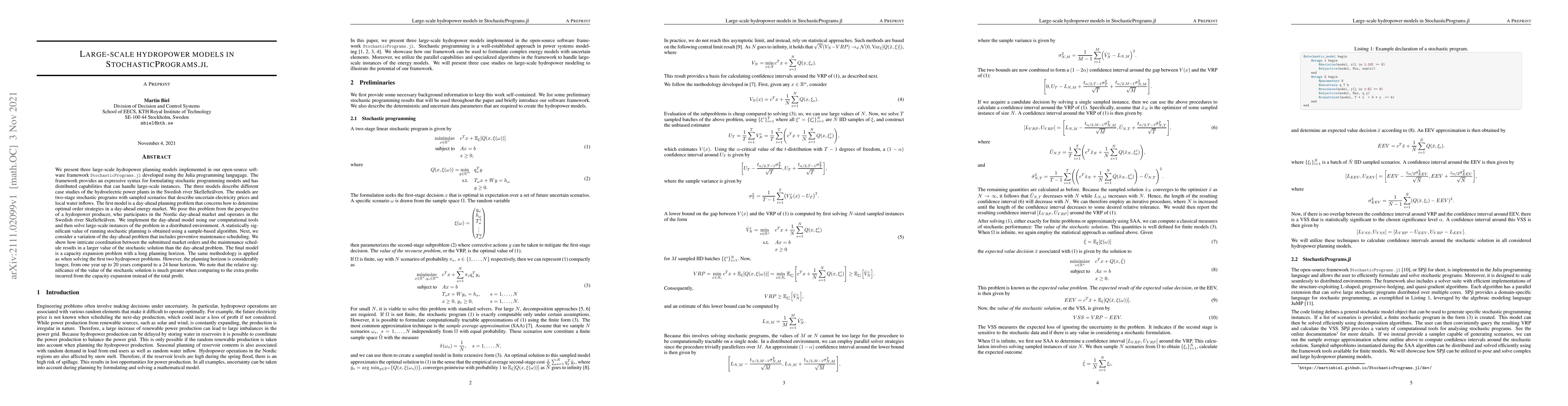 This paper presents three large-scale hydropower planning models using StochasticPrograms.jl that demonstrate the value of stochastic optimization in managing uncertain electricity prices and water inflows for hydroelectric power plants in Sweden.