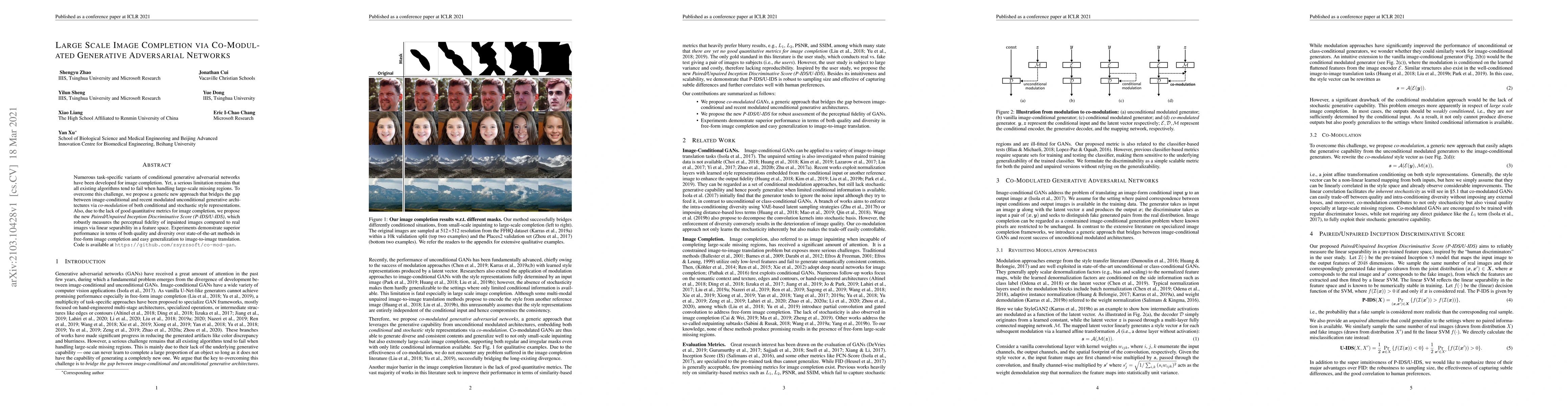 This paper proposes a co-modulated generative adversarial network for large-scale image completion, addressing the limitation of existing algorithms. It introduces a new metric, P-IDS/U-IDS, for evaluating image completion quality and demonstrates superior performance over state-of-the-art methods.