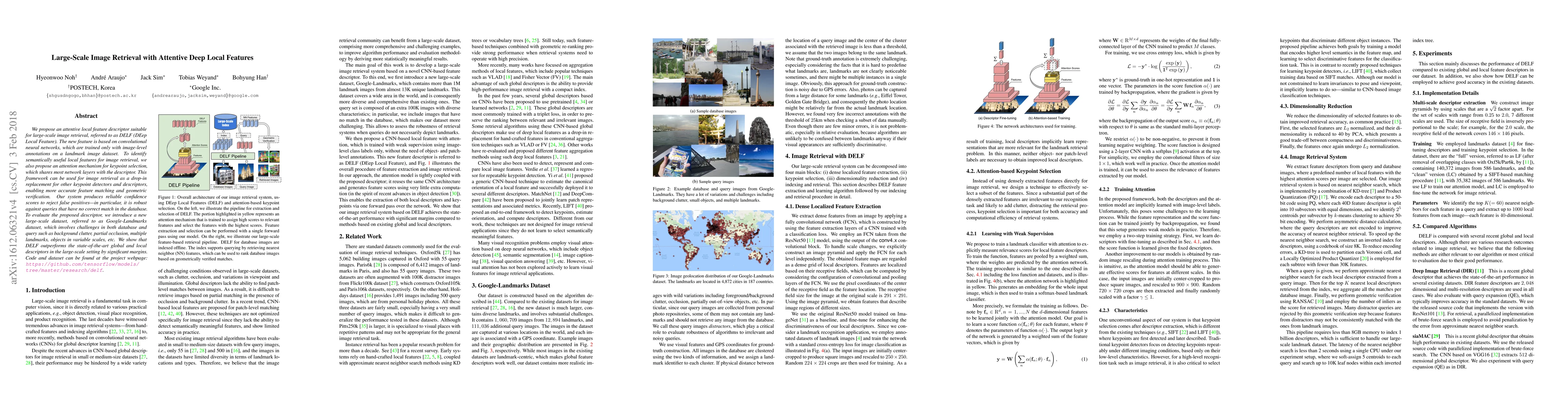 The paper proposes DELF, an attentive deep local feature descriptor for large-scale image retrieval, which uses convolutional neural networks trained on landmark image datasets and an attention mechanism for keypoint selection. The system outperforms existing methods and is robust against queries with no correct matches, evaluated on a new Google-Landmarks dataset.