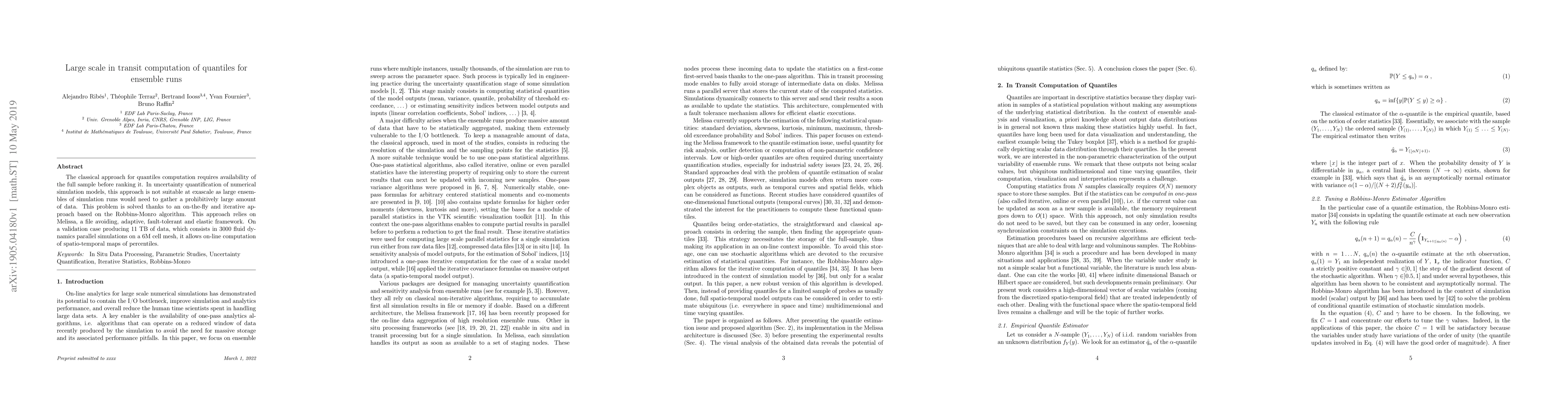 The classical approach for quantiles computation requires availability of the full sample before ranking it. In uncertainty quantification of numerical simulation models, this approach is not suitable at exascale as large ensembles of simulation runs would need to gather a prohibitively large amount of data. This problem is solved thanks to an on-the-fly and iterative approach based on the Robbins-Monro algorithm. This approach relies on Melissa, a file avoiding, adaptive, fault-tolerant and elastic framework. On a validation case producing 11 TB of data, which consists in 3000 fluid dynamics parallel simulations on a 6M cell mesh, it allows on-line computation of spatio-temporal maps of percentiles.