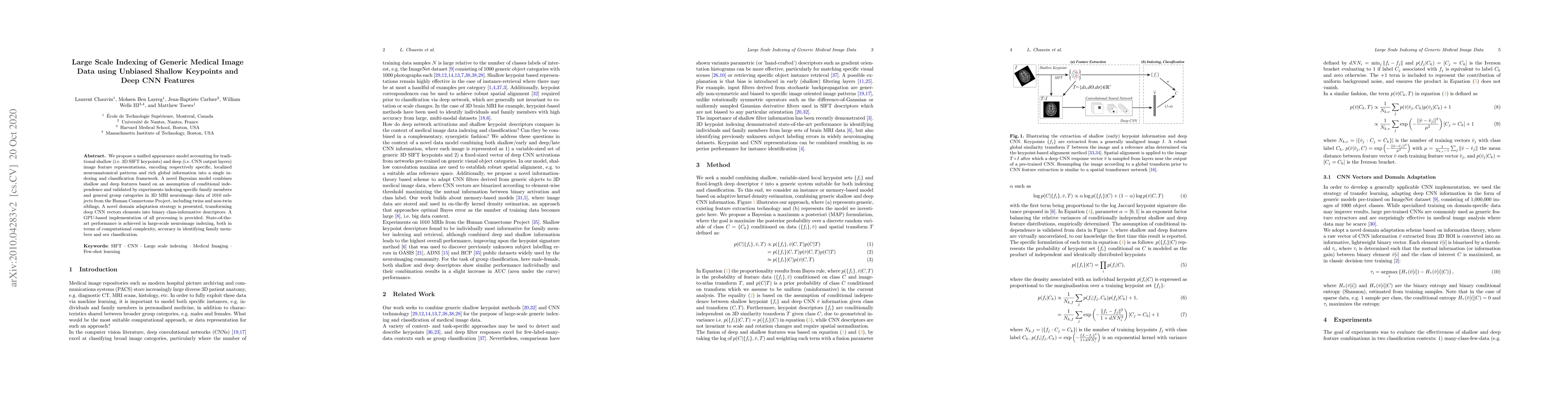 We propose a unified appearance model accounting for traditional shallow (i.e. 3D SIFT keypoints) and deep (i.e. CNN output layers) image feature representations, encoding respectively specific, localized neuroanatomical patterns and rich global information into a single indexing and classification framework. A novel Bayesian model combines shallow and deep features based on an assumption of conditional independence and validated by experiments indexing specific family members and general group categories in 3D MRI neuroimage data of 1010 subjects from the Human Connectome Project, including twins and non-twin siblings. A novel domain adaptation strategy is presented, transforming deep CNN vectors elements into binary class-informative descriptors. A GPU-based implementation of all processing is provided. State-of-the-art performance is achieved in large-scale neuroimage indexing, both in terms of computational complexity, accuracy in identifying family members and sex classification.