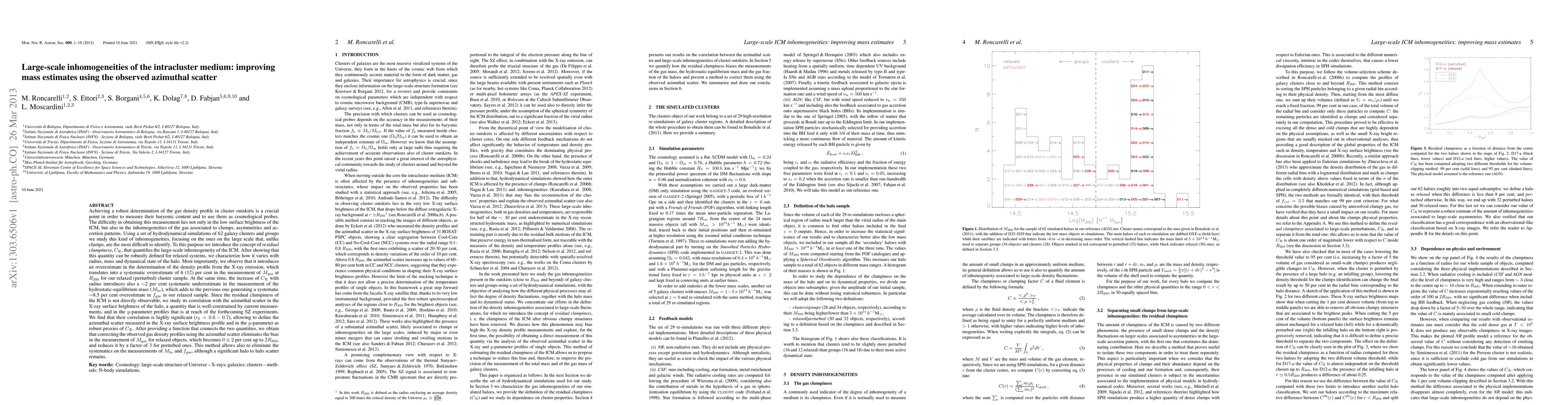 Using a set of hydrodynamical simulations of 62 galaxy clusters and groups we study the ICM of inhomogeneities, focusing on the ones on the large scale that, unlike clumps, are the most difficult to identify. To this purpose we introduce the concept of residual clumpiness, C_R, that quantifies the large-scale inhomogeneity of the ICM. After showing that this quantity can be robustly defined for relaxed systems, we characterize how it varies with radius, mass and dynamical state of the halo. Most importantly, we observe that it introduces an overestimate in the determination of the density profile from the X-ray emission, which translates into a systematic overestimate of 6 (12)% in the measurement of M_gas at R_200 for our relaxed (perturbed) cluster sample. At the same time, the increase of C_R with radius introduces also a ~2% systematic underestimate in the measurement of the hydrostatic-equilibrium mass (M_he), which adds to the previous one generating a systematic ~8.5% overestimate in f_gas in our relaxed sample. Since the residual clumpiness of the ICM is not directly observable, we study its correlation with the azimuthal scatter in the X-ray surface brightness of the halo and in the y-parameter profiles. We find that their correlation is highly significant (r_S = 0.6-0.7), allowing to define the azimuthal scatter measured in the X-ray surface brightness profile and in the y-parameter as robust proxies of C_R. After providing a function that connects the two quantities, we obtain that correcting the observed gas density profiles using the azimuthal scatter eliminates the bias in the measurement of M_gas for relaxed objects, which becomes (0+/-2)% up to 2R_200, and reduces it by a factor of 3 for perturbed ones. This method allows also to eliminate the systematics on the measurements of M_he and f_gas, although a significant halo to halo scatter remains. (abridged)