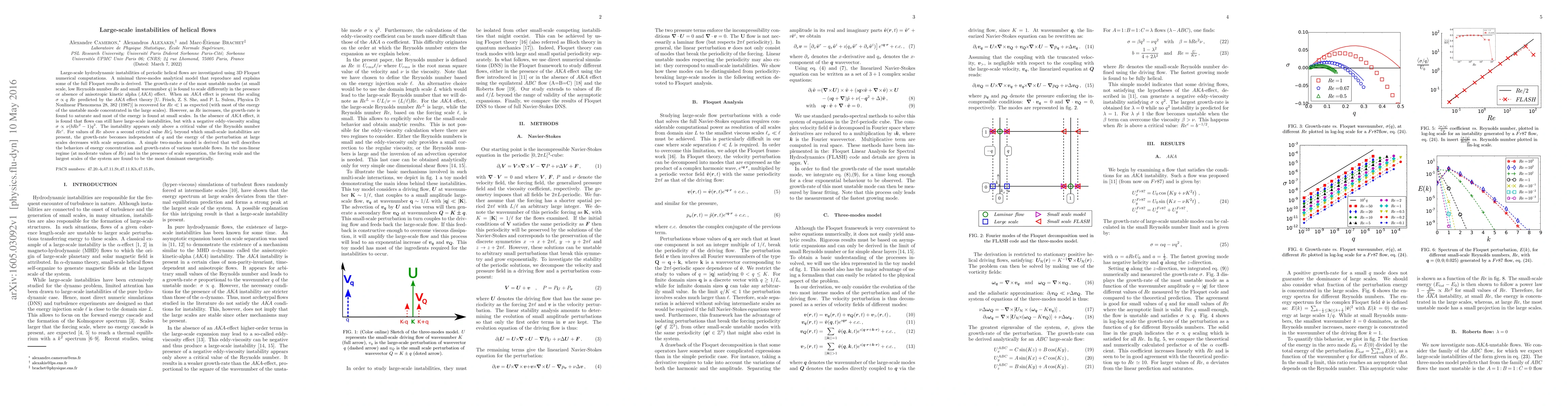 Large-scale hydrodynamic instabilities of periodic helical flows are investigated using $3$D Floquet numerical computations. A minimal three-modes analytical model that reproduce and explains some of the full Floquet results is derived. The growth-rate $\sigma$ of the most unstable modes (at small scale, low Reynolds number $Re$ and small wavenumber $q$) is found to scale differently in the presence or absence of anisotropic kinetic alpha (\AKA{}) effect. When an $AKA$ effect is present the scaling $\sigma \propto q\; Re\,$ predicted by the $AKA$ effect theory [U. Frisch, Z. S. She, and P. L. Sulem, Physica D: Nonlinear Phenomena 28, 382 (1987)] is recovered for $Re\ll 1$ as expected (with most of the energy of the unstable mode concentrated in the large scales). However, as $Re$ increases, the growth-rate is found to saturate and most of the energy is found at small scales. In the absence of \AKA{} effect, it is found that flows can still have large-scale instabilities, but with a negative eddy-viscosity scaling $\sigma \propto \nu(b Re^2-1) q^2$. The instability appears only above a critical value of the Reynolds number $Re^{c}$. For values of $Re$ above a second critical value $Re^{c}_{S}$ beyond which small-scale instabilities are present, the growth-rate becomes independent of $q$ and the energy of the perturbation at large scales decreases with scale separation. A simple two-modes model is derived that well describes the behaviors of energy concentration and growth-rates of various unstable flows. In the non-linear regime (at moderate values of $Re$) and in the presence of scale separation, the forcing scale and the largest scales of the system are found to be the most dominant energetically.